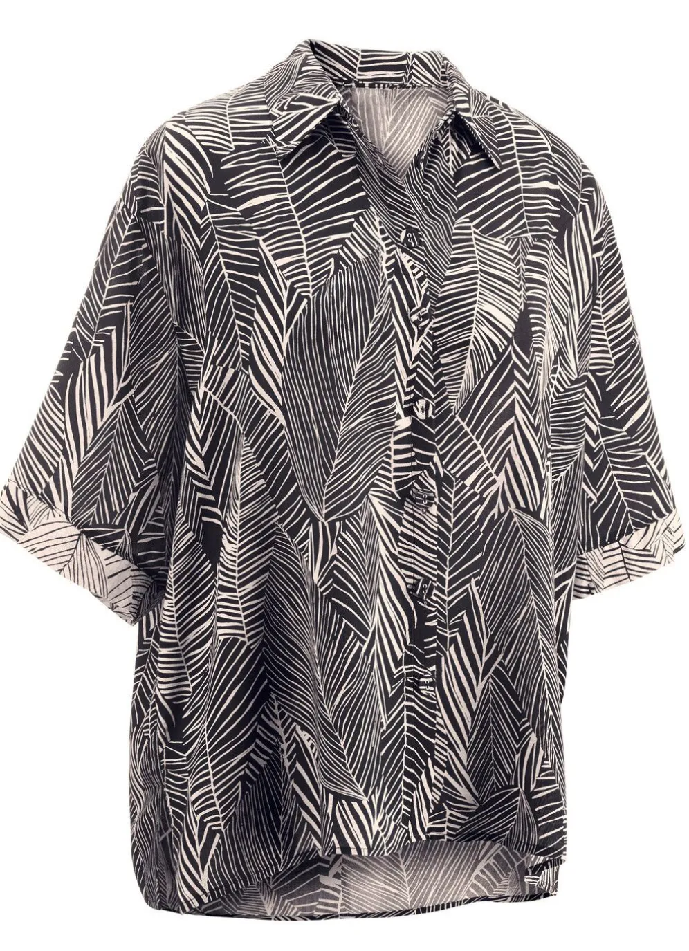 Durchgeknöpfte „Laurina“-Bluse mit Alloverdessin in Schwarz-Ecru, Reverskragen, Kontrastblenden an den kurzen Ärmeln sowie Seitenschlitzen. Länge ab 70 cm.