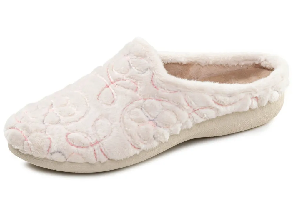 Hausschuhe von „Laurina“, aus flauschigem Textilmaterial mit kontrastfarbener Blumen-Stickerei: Futter und Decksohle aus gepolstertem Samt, leichte Gummi-Laufsohle sowie 15 mm Keilabsatz