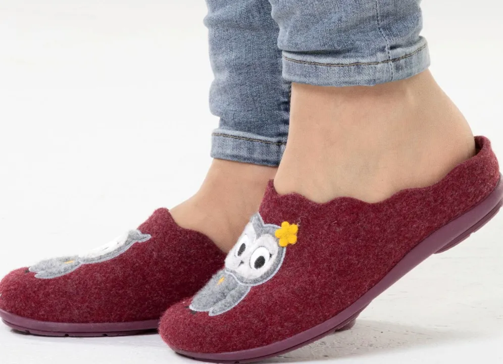 Hausschuhe von „Laurina“, aus Filz mit niedlicher Eulen-Applikation: herausnehmbares Textil-Fußbett, superleichte Gummi-Laufsohle sowie 10 mm Keilabsatz