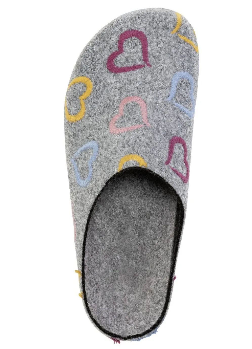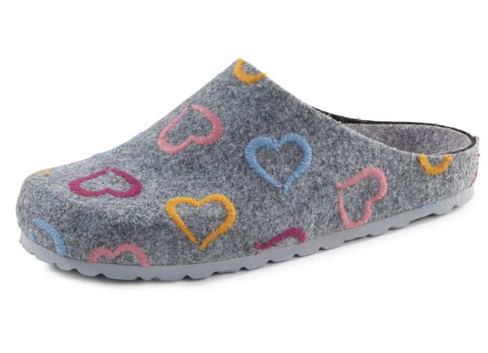 Hausschuhe von „Laurina“ aus grauem Filz mit bunter Herzchen-Stickerei: Weite H, Futter und anatomisches Fußbett aus Filz, leichte EVA-Profilsohle mit flachem Keilabsatz