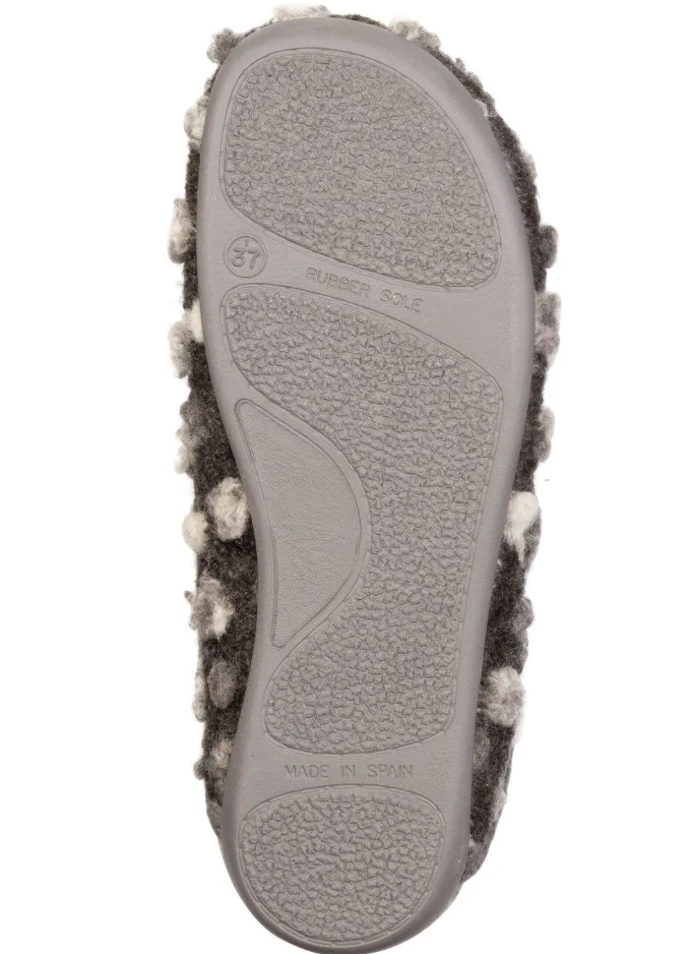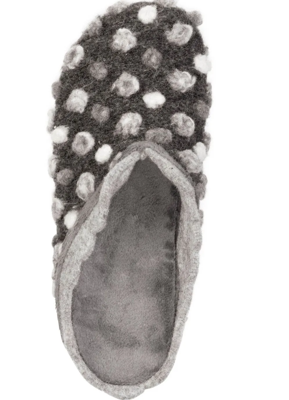Hausschuhe von „Laurina“, aus Filz mit Pünktchen-Dessin: Textilfutter, herausnehmbares Fußbett, leichte Gummi-Laufsohle sowie 10 mm Keilabsatz
