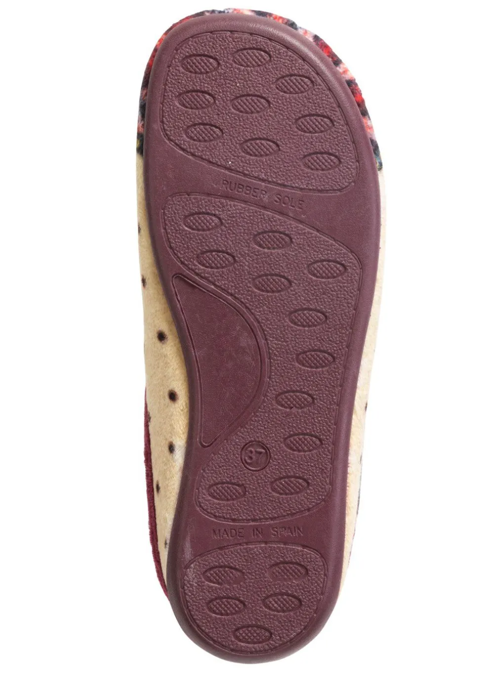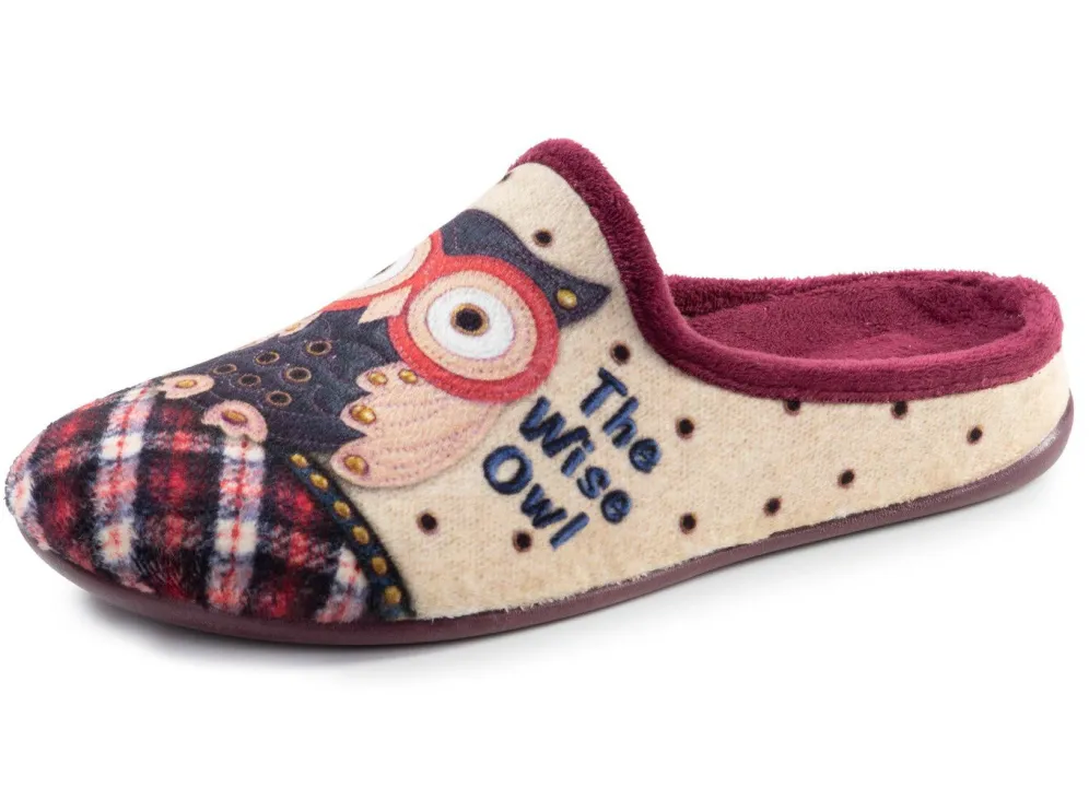 Hausschuhe von „Laurina“, in Ecru-Bunt aus samtigem Textilmaterial mit niedlichem Eulen-Motiv: Weite G, gepolstertes Textilfutter, herausnehmbares Fußbett, flache Gummi-Laufsohle