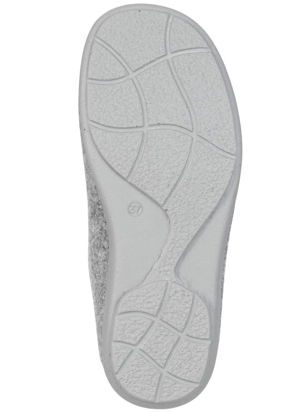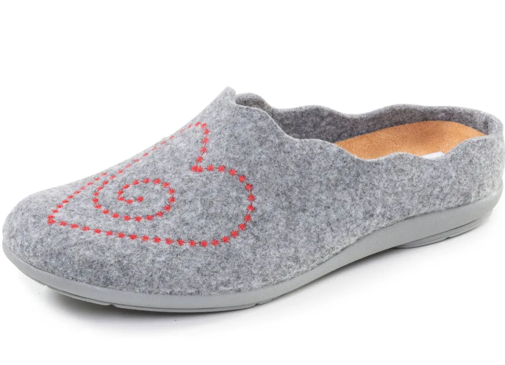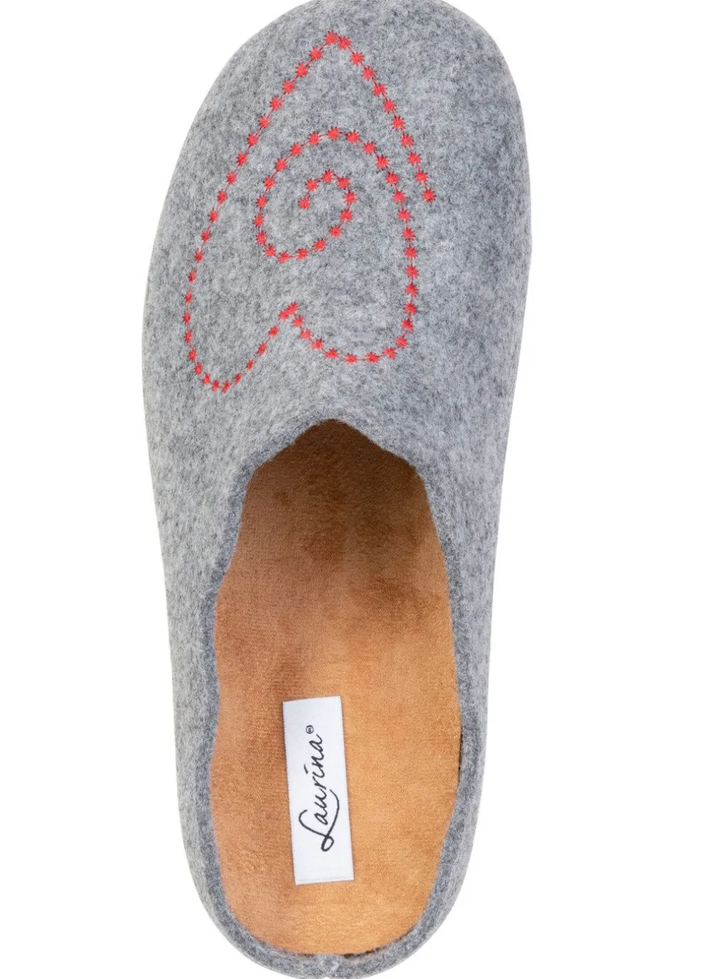 Hausschuhe von Laurina aus Filzmaterial mit hübscher, roter Herz-Stickerei: herausnehmbares Fußbett, Gummi-Laufsohle sowie 15 mm Keilabsatz