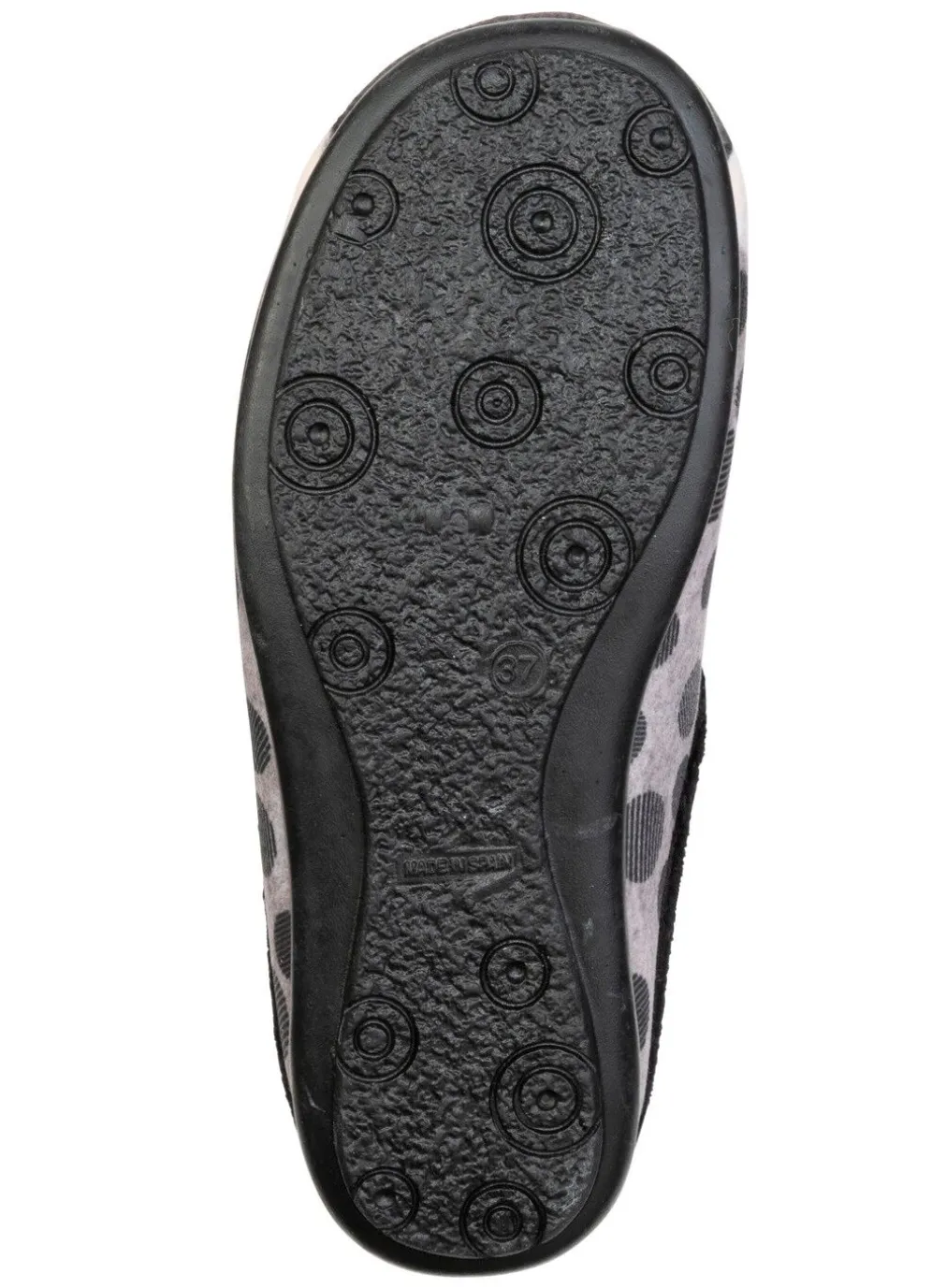 Hausschuhe von „Laurina“ in Schwarz-Multicolor, aus Textilmaterial mit Katzen-Motiv: Futter und gepolsterte Decksohle aus Textil, leichte Gummi-Laufsohle sowie 10 mm Keilabsatz