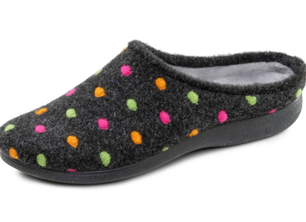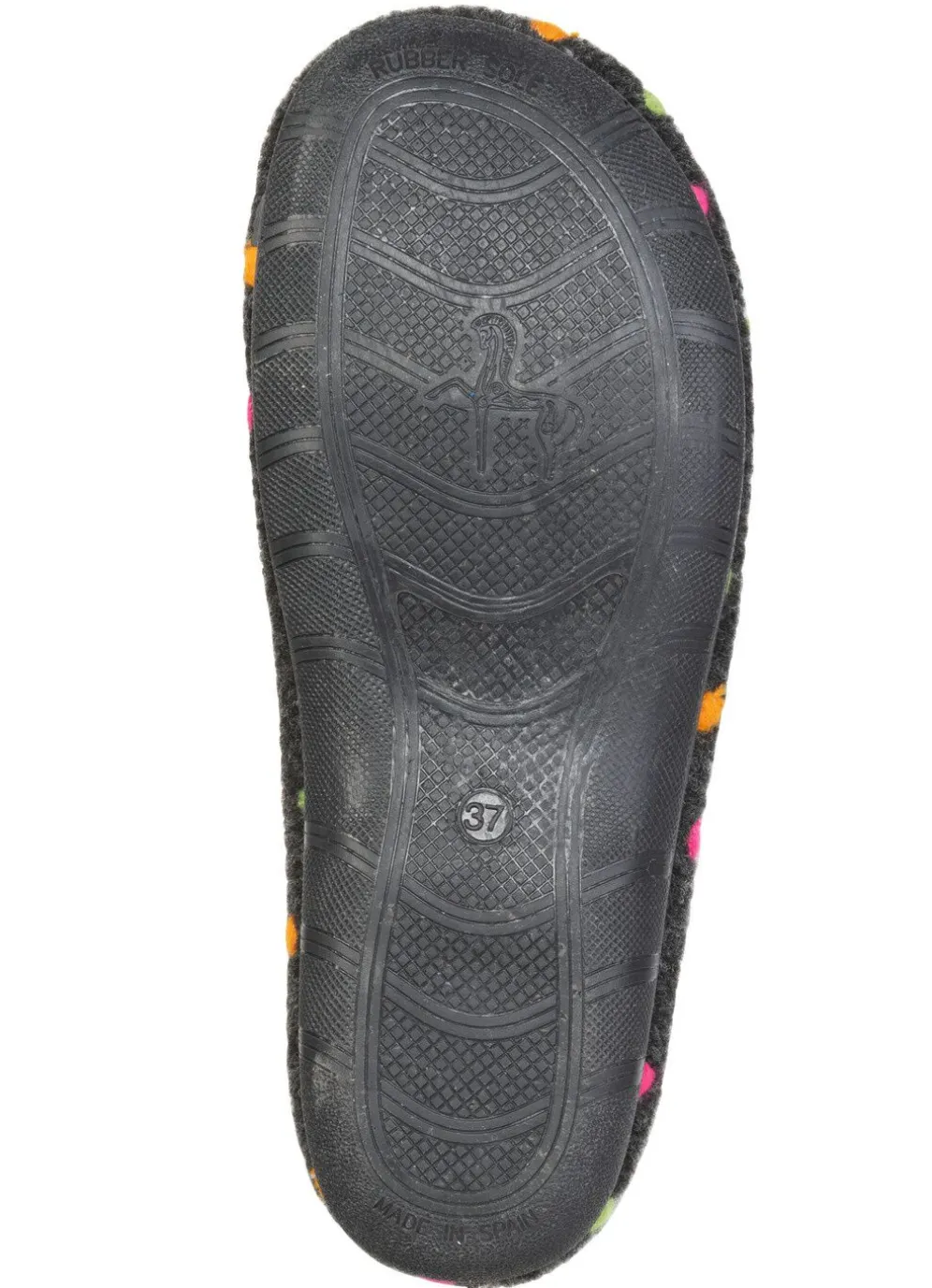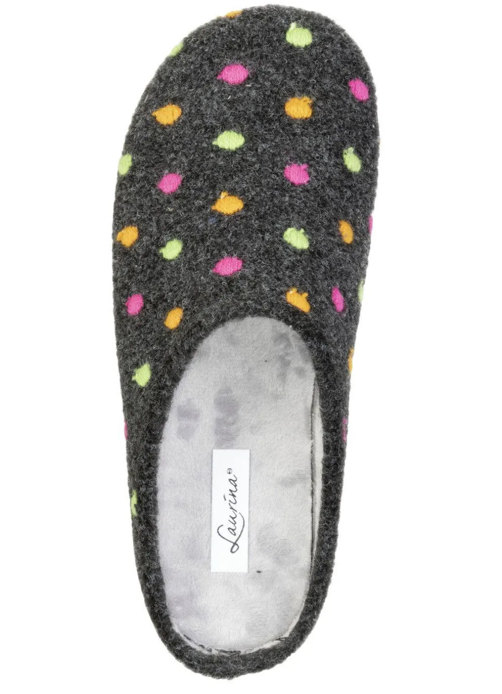 Hausschuhe von Laurina aus Textilmaterial mit bunter Pünktchen-Stickerei: Futter und gepolsterte Decksohle aus weichem Samt, leichte Gummi-Laufsohle sowie 15 mm Keilabsatz