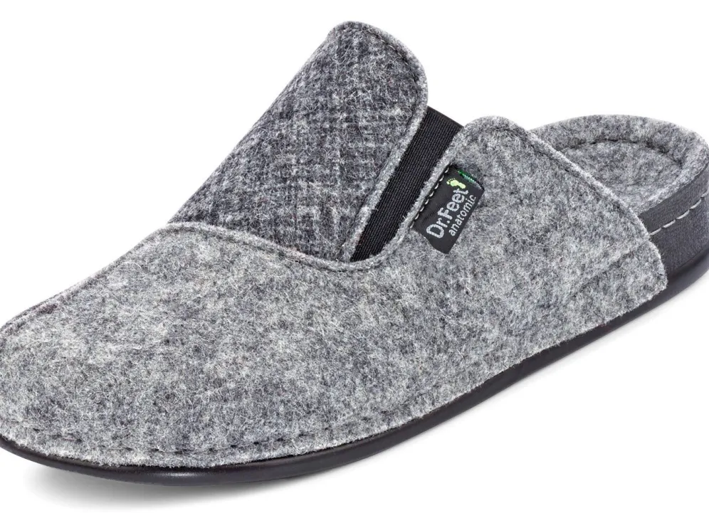 Hausschuhe von „Laurina“ in Grau, aus teilweise bedrucktem Wollfilz: in Weite H, seitlicher Gummizug, anatomisches Filz-Fußbett, superleichte PU-Laufsohle sowie 20 mm Keilabsatz