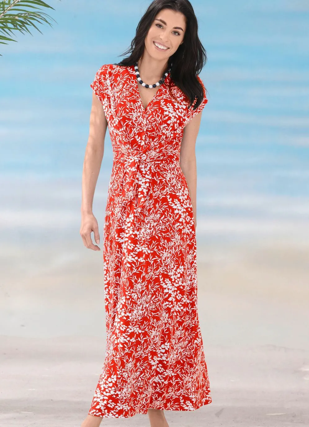 Marinefarbenes „Laurina“-Kleid mit überschnittenen Ärmeln und floralem, weißem Druckdessin allover. Die kleine Knopfleiste, der Gummizug im Rückteil sowie die eingearbeiteten Bindebänder sorgen für eine raffinierte Optik und optimale Passform. Länge ca. 126 cm.