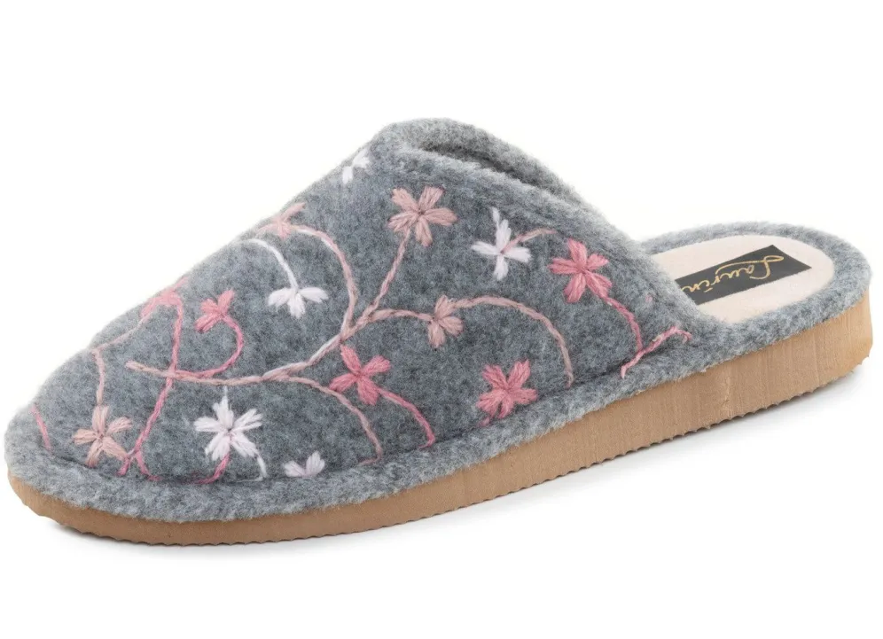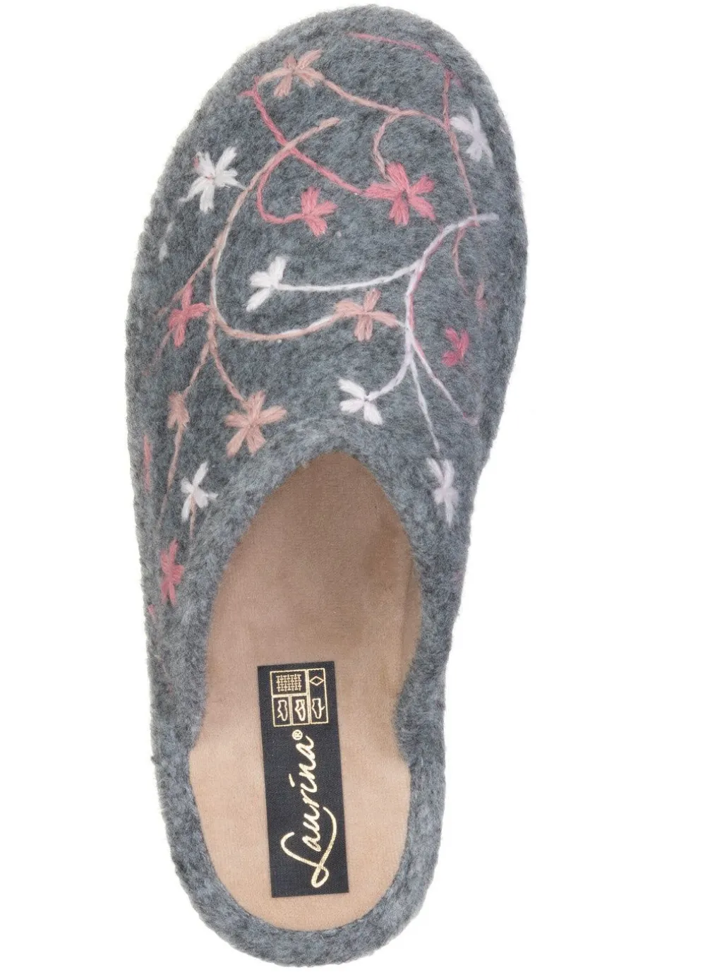 Superleichte Hausschuhe von Laurina aus Filz mit Blüten-Stickerei in Rosa-Weiß: Futter und Decksohle aus weichem Samt, EVA-Riffelsohle sowie 10 mm Keilabsatz