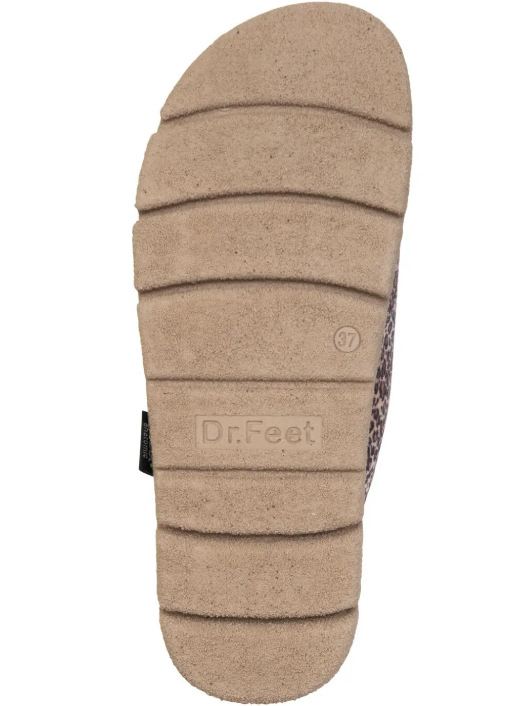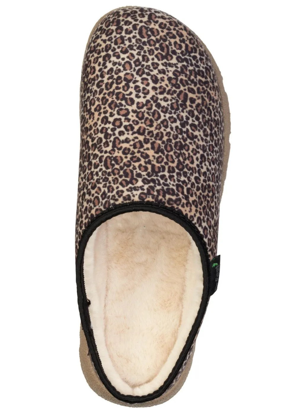 Modische Hausschuhe von „Laurina“, aus samtigem, braunem Textilmaterial, mit rassigem Leoparden-Dessin: Futter und Decksohle aus flauschigem Plüsch, leichte PU-Profilsohle sowie 10 mm Keilabsatz