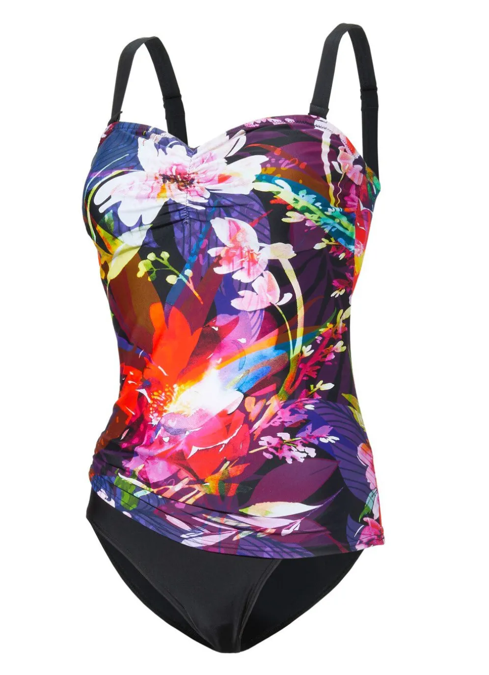 Schwarzer „Laurina“-Tankini in Bandeauform mit buntem Druckdessin allover, kleiner Raffung in der Büstenmitte, verstell- und abnehmbaren Trägern, Softschalen und Unterbrustband. Schwarzes Höschen mit Vorderfutter.