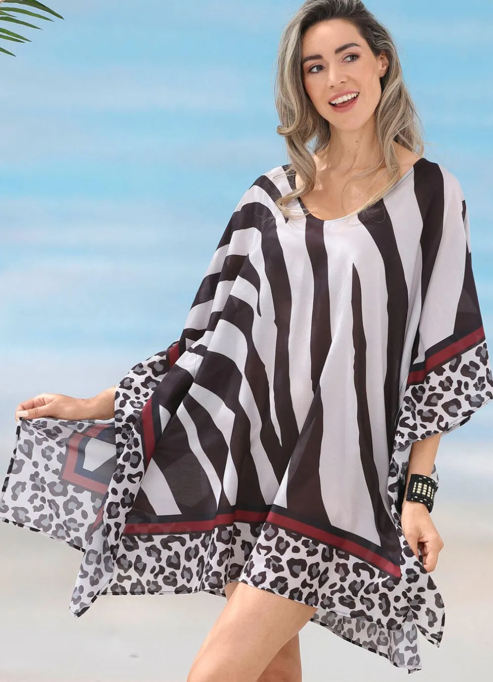 Traumhafte, leicht transparente „Laurina“-Tunika in Creme-Schwarz-Bunt. Länge ca. 88 cm.