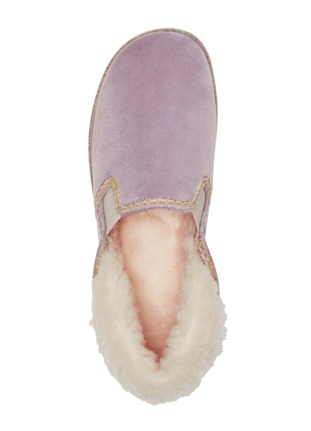 Hausschuhe von „Laurina“, aus samtigem Textil, mit hübscher Bordüre: zwei seitliche Gummizüge, flauschiger Kragen, Warmfutter und Decksohlenbezug aus 100% Schurwolle, leichte Gummi-Riffelsohle