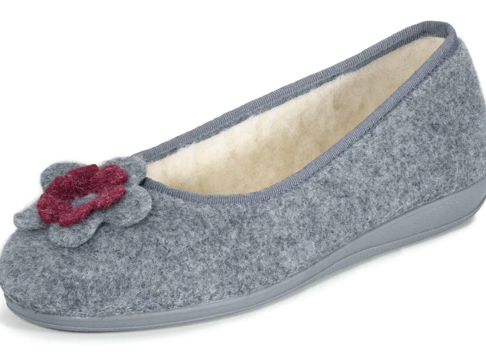 Hausschuhe von Laurina, aus flauschigem Textil mit Zierblüte: Warmfutter und Decksohle aus 100% Schurwolle, superleichte Gummi-Laufsohle sowie 10 mm Keilabsatz