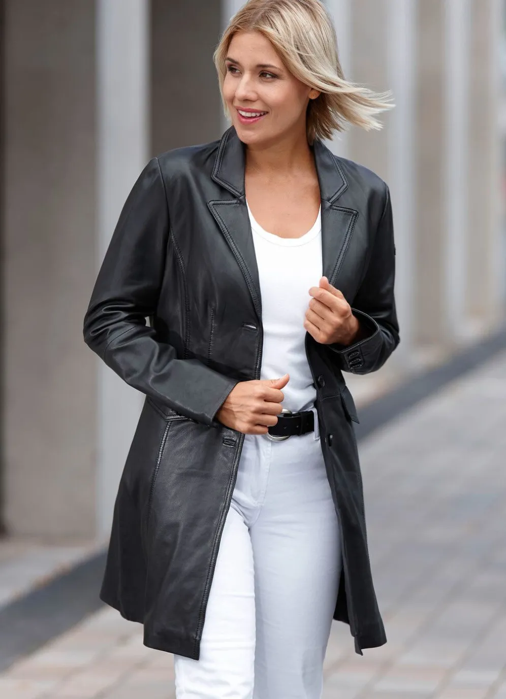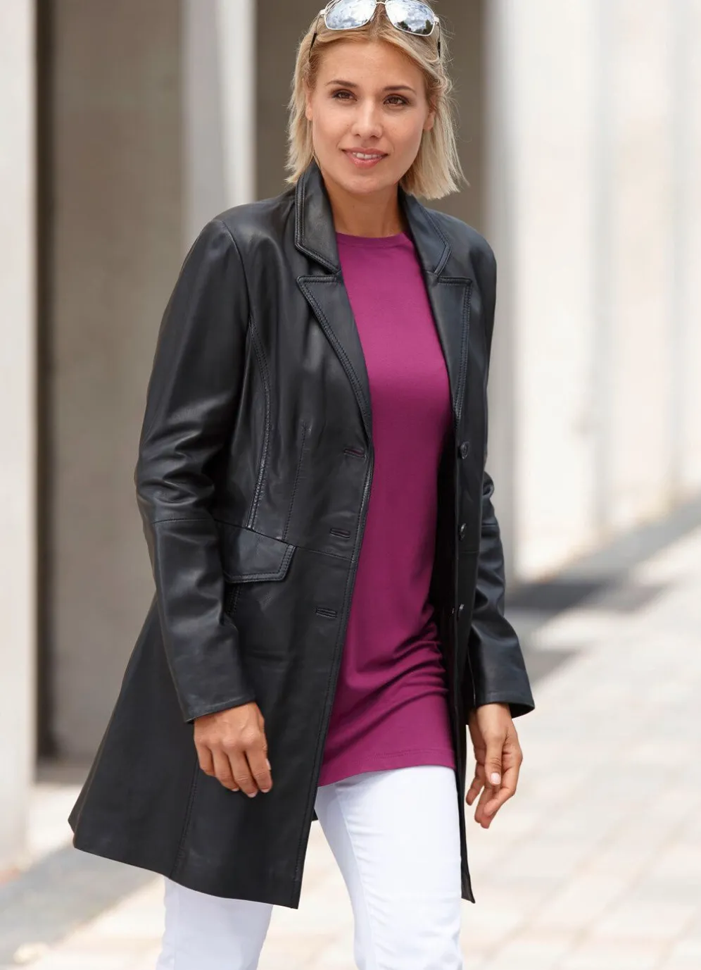 Setzen Sie topmodische Akzente mit diesem einreihigen Kurzmantel aus wunderbar weichem Lamm-Nappaleder, mit Reverskragen, 3-Knopf-Verschluss, Pattentaschen, zwei Innentaschen, Ärmelabschlüssen mit Zierknöpfen sowie Rückenschlitz.