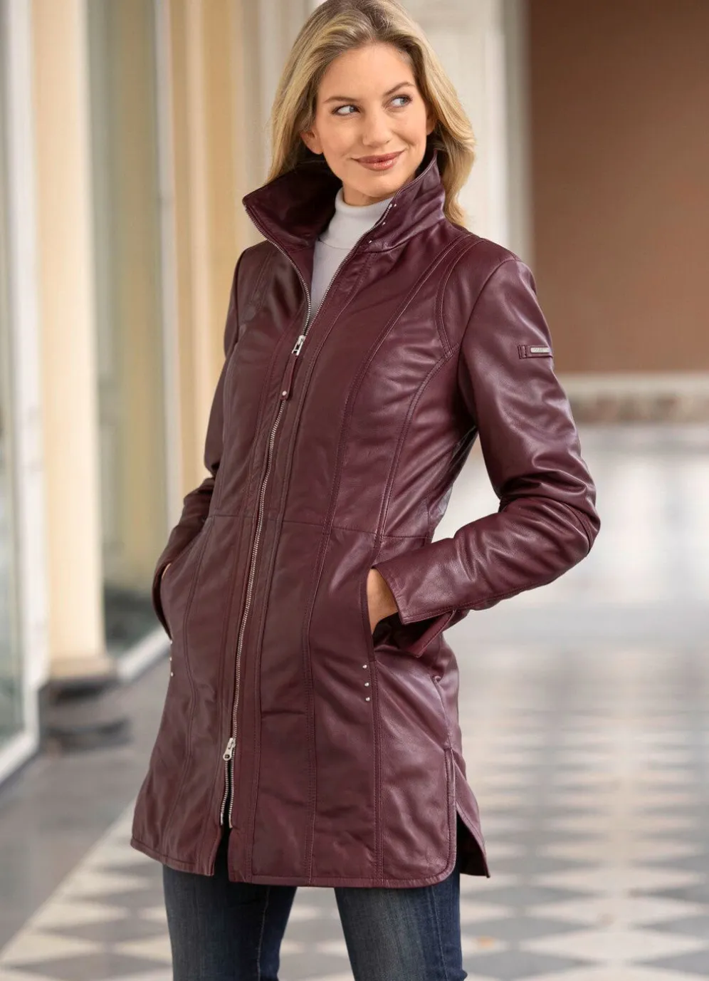 Stilsicherer Kurzmantel von „Cabrini“ aus weichem Lamm-Nappaleder, mit Steh-Umlegekragen, Nietenzier im Vorderteil und am Kragen, 2-Wege-Reißverschluss, Taschen mit Drucker, Seitenschlitze mit abgerundetem Saum, Ärmelabschlüsse mit Schlitz sowie zwei Innentaschen.