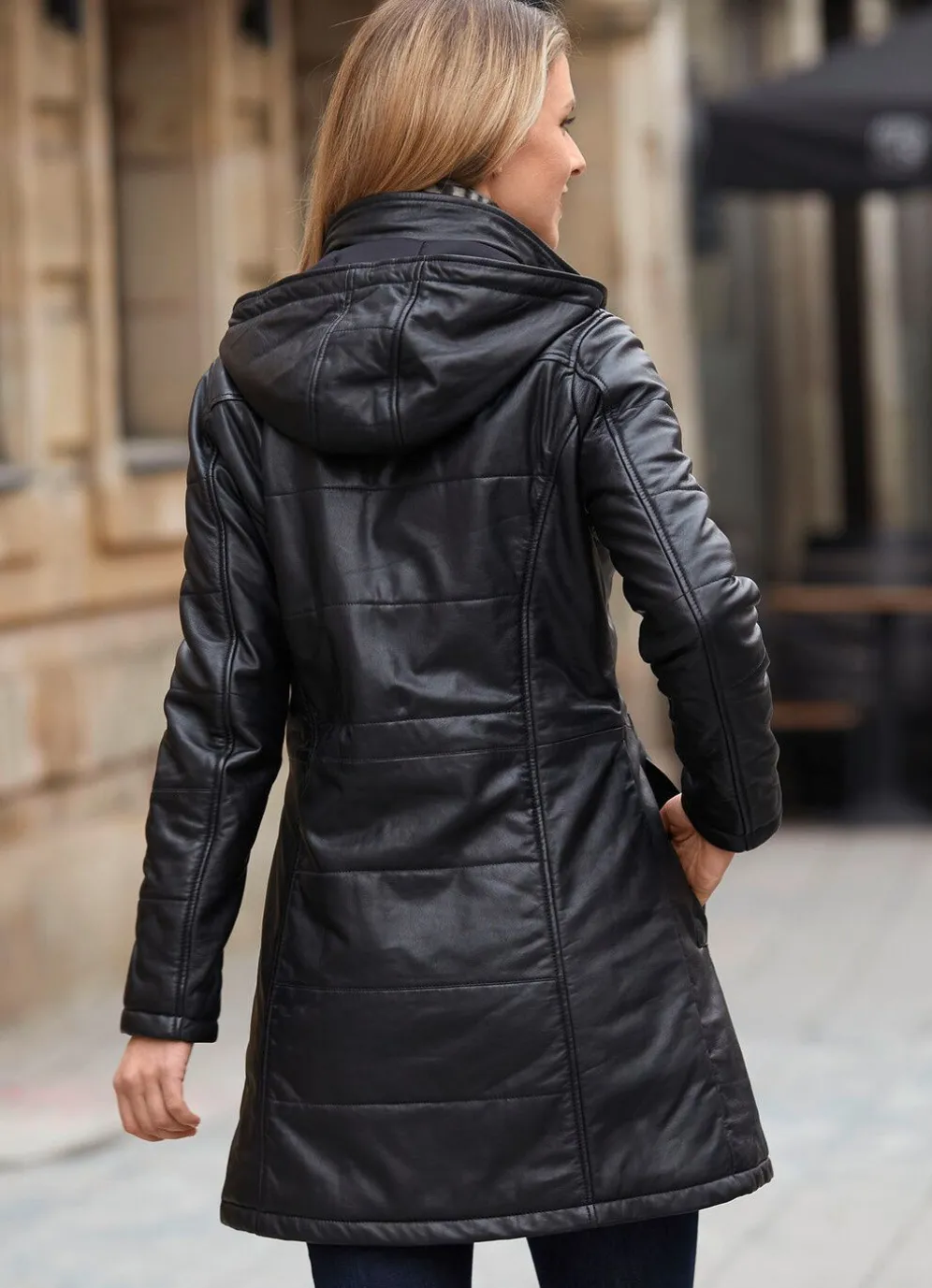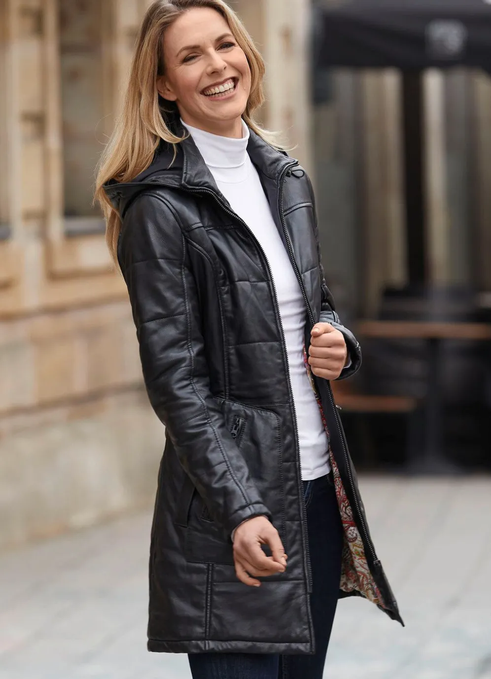 Wunderschöner „Caminari“-Kurzmantel aus unglaublich weichem Lamm-Nappaleder in Schwarz: abtrennbare Kapuze mit Durchzugsband und Stopper am Steh-Umlegekragen, Reißverschluss, zwei Reißverschluss-Taschen, zwei Taschen mit Drucker sowie einer Innentasche.