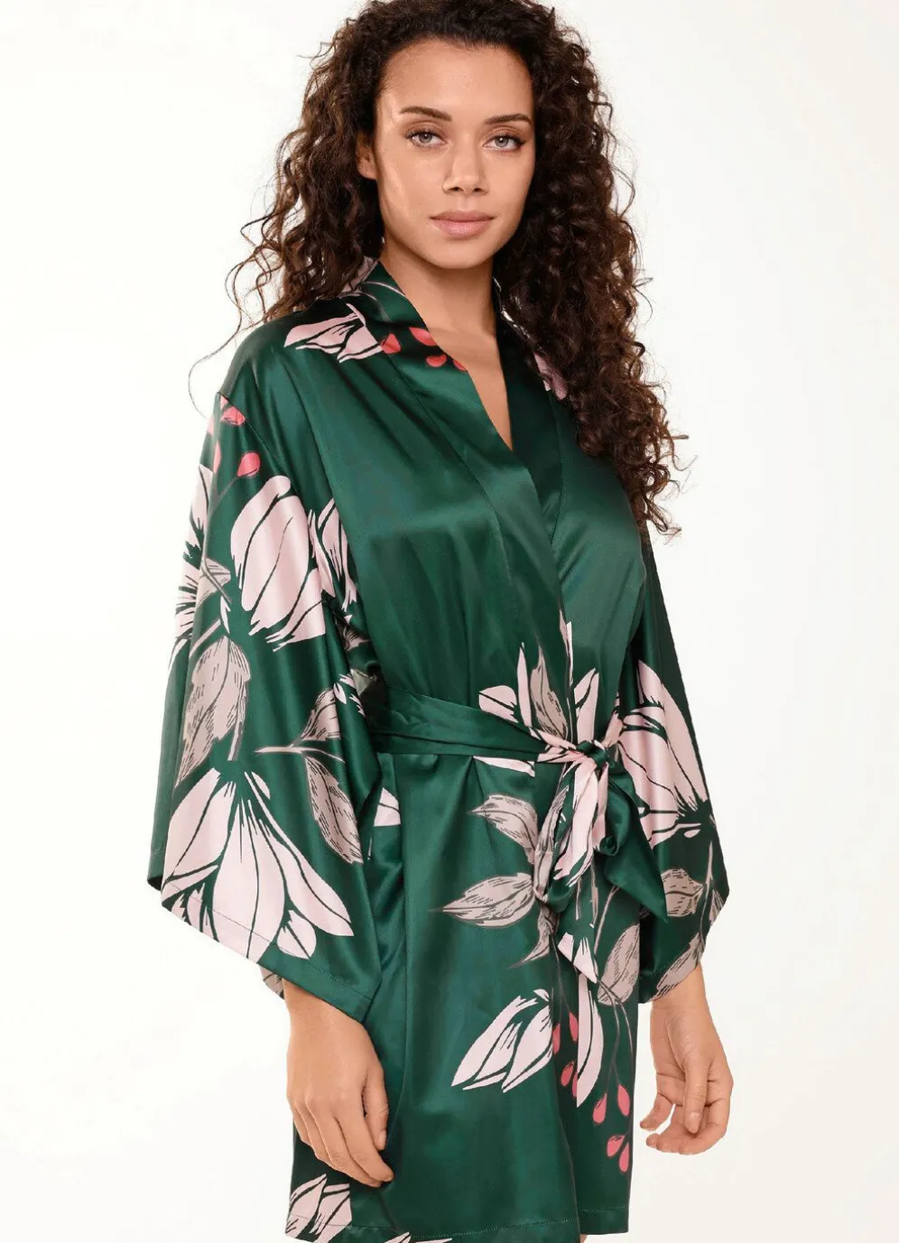 Edel schimmernder, dunkelgrüner Kimono von „LingaDore“, mit rosé-oliv-buntem Druckdessin, weiten Ärmeln sowie angenähtem Bindegürtel.