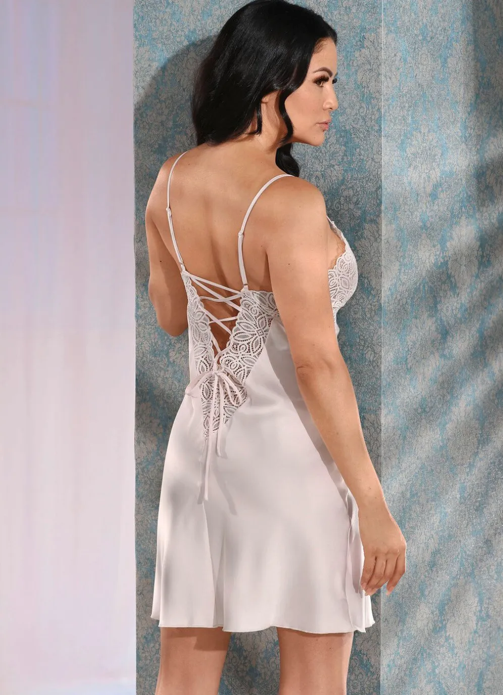 Zauberhaftes „LingaDore“-Negligé in Puder, mit hübscher Elastikspitze im Vorder- und Rückteil, raffinierter, rückwärtiger Schnürung sowie verstellbaren Spaghettiträgern.