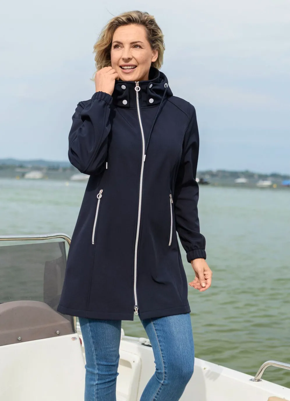 Longjacke in Nachtblau, mit Riegel, Druckern und Kordel an der abnehmbaren Kapuze, durch 2-Wege-Reißverschluss hoch schließbarem Stehkragen, Reißverschlusstaschen, elastischen Ärmelabschlüssen. Länge ca. 86 cm, ab Gr. 40 ca. 88 cm, ab Gr. 44 ca. 90 cm, ab Gr. 48 ca. 92 cm, bei Gr. 52 ca. 94 cm.