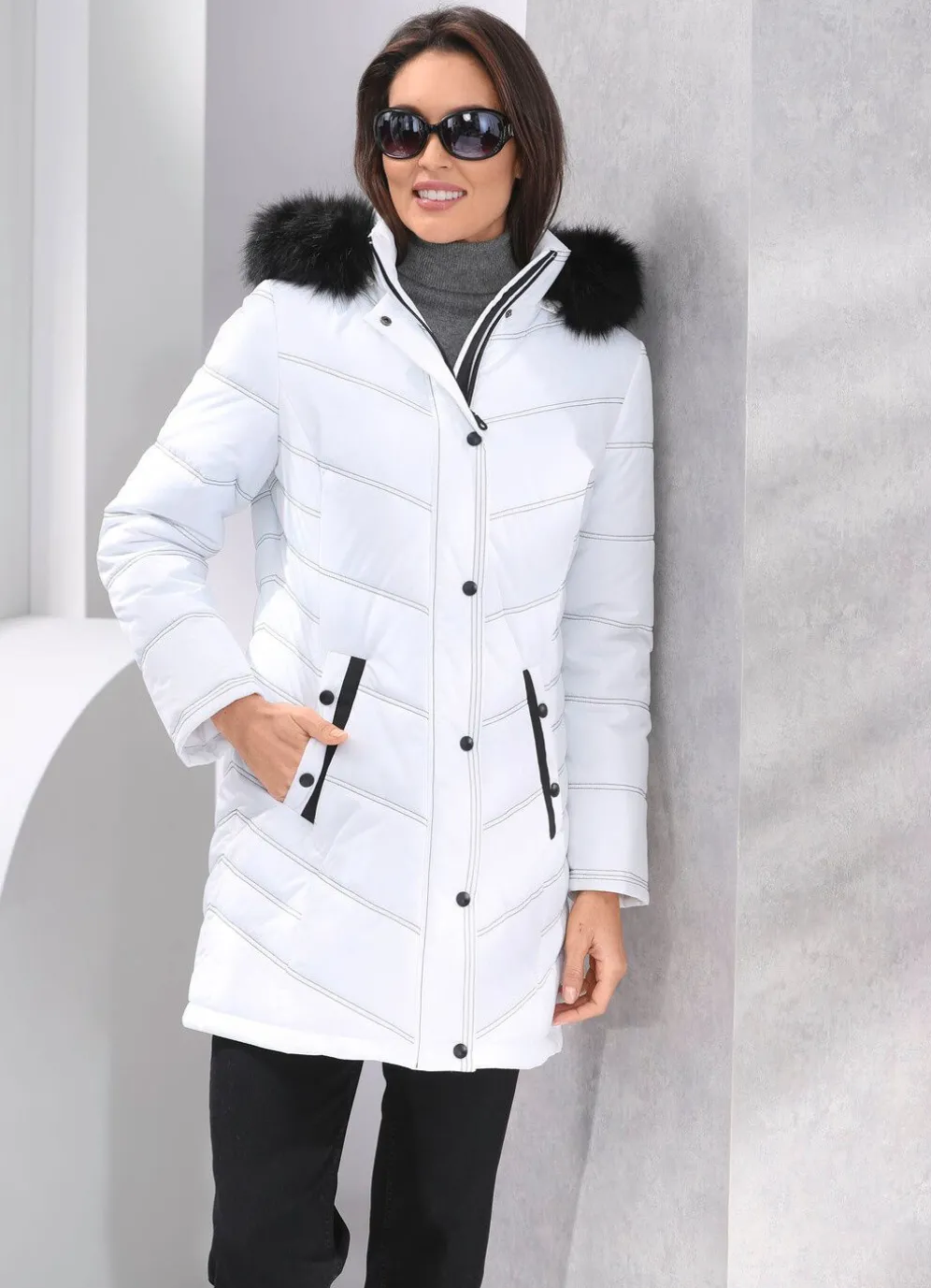 Weiße Longjacke mit Durchzugsband, Stopper und abnehmbarem Kunstpelz-Besatz an der abnehmbaren Kapuze, durch 2-Wege-Reißverschluss unter der Druckerleiste hoch schließbarem Stehkragen, Blende und Druckern an den Schubtaschen, umschlagbaren Ärmeln sowie einer Innentasche. Länge ca. 86 cm.