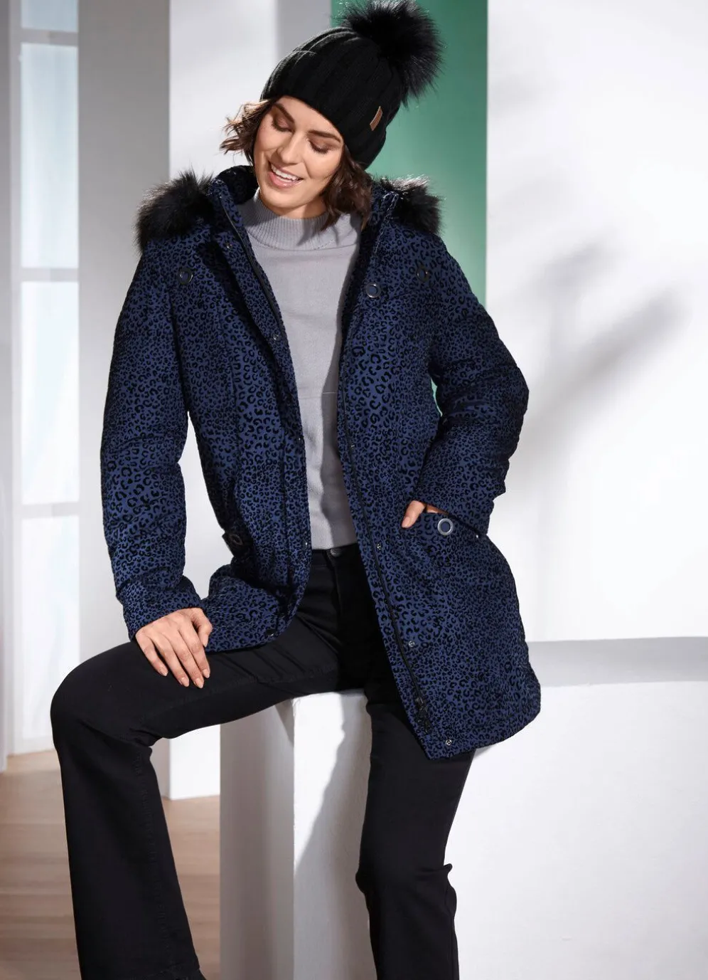 Außergewöhnliche, blaue Longjacke mit dekorativem, samtig beflocktem Raubtierfell-Dessin in Schwarz: abnehmbare Kapuze mit Durchzugsband, Stopper und abnehmbarem Kunstpelz-Besatz, durch 2-Wege-Reißverschluss unter der Druckerleiste hoch schließbarer Stehkragen, umschlagbare Ärmel, eine Innentasche, Zierösen auf der Blende der Taschen sowie im Vorder- und Rückteil. Länge ca. 85 cm, bei K-Gr. ca. 80 cm.