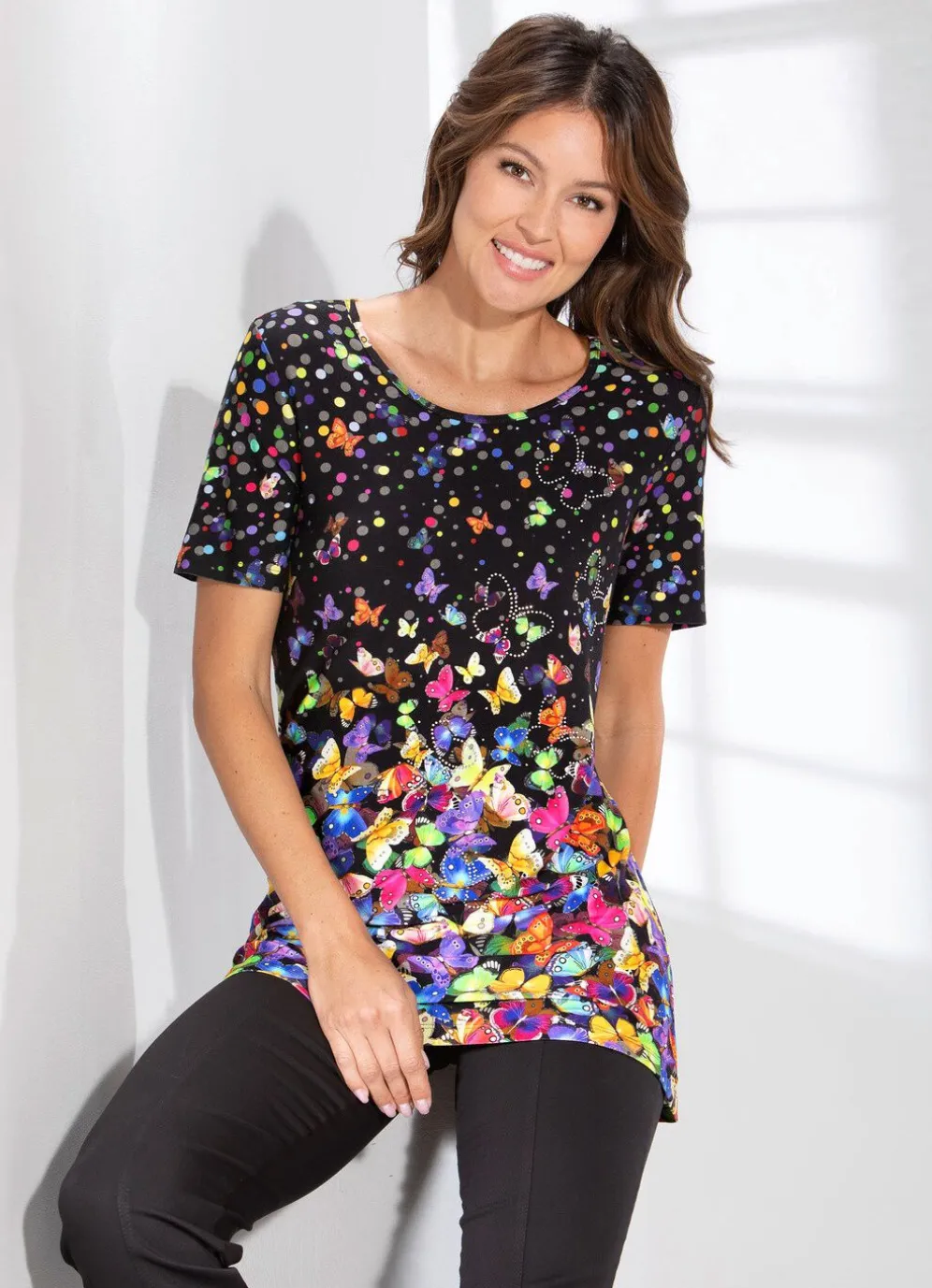 Jedes Teil ein Unikat! Große Klasse ist dieses ausdrucksstarke Longshirt mit farbbrillantemDruck in Multicolor allover sowie Strasszier im Vorderteil.