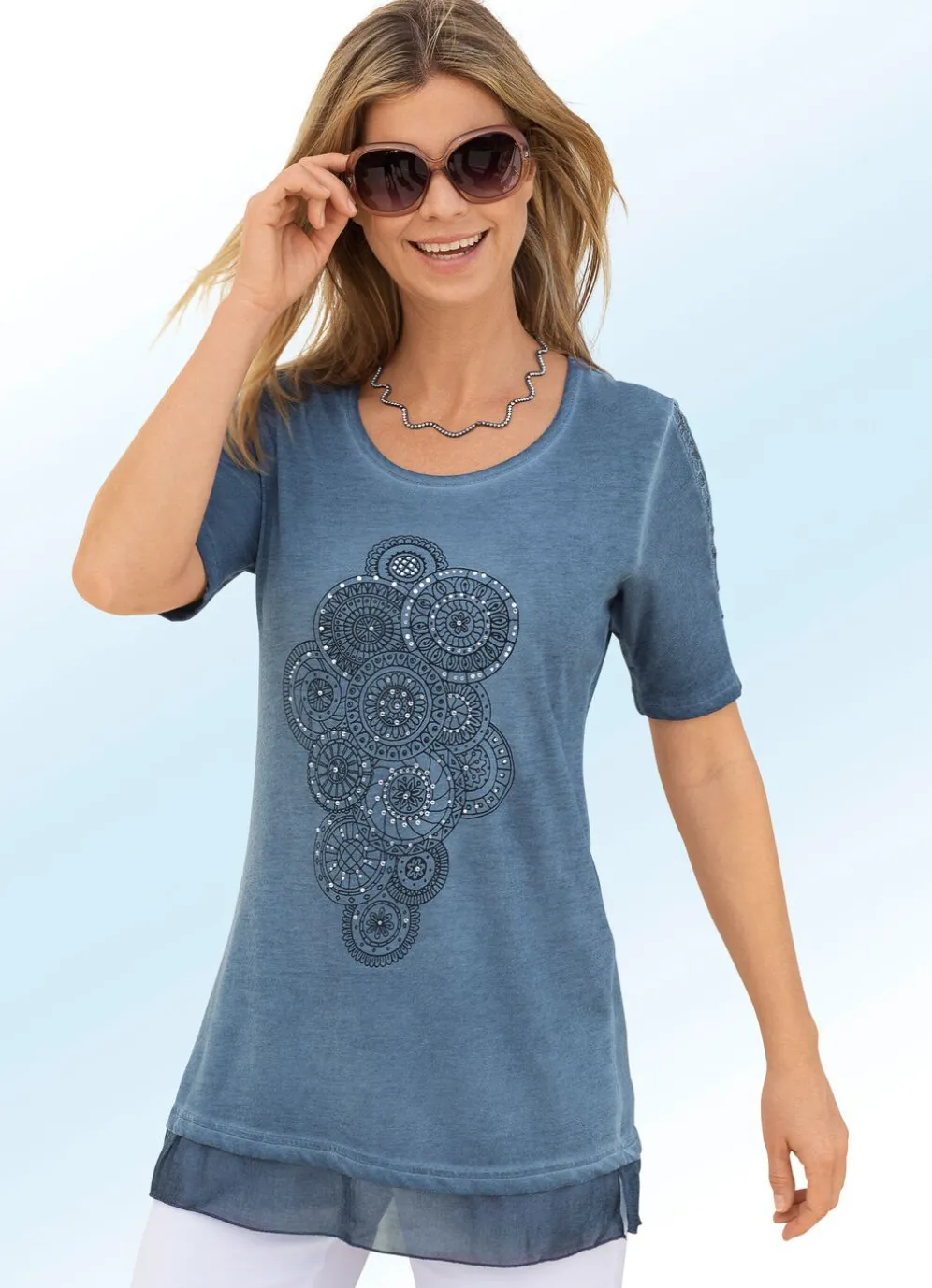 Jedes Teil ein Unikat! In angesagter Kaltfärbung zeigt sich dieses jeansblaue Longshirt mit Kontrast-Druck und Strasszier im Vorderteil, Spitzeneinsatz an den Ärmeln sowie gekäntelter, geschlitzter Chiffon-Abschluss am Saum.