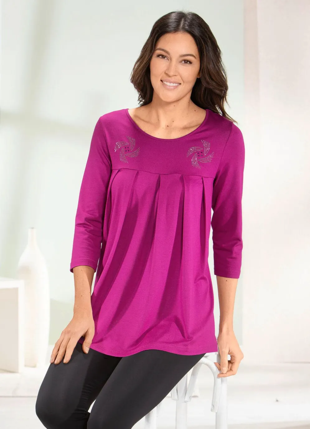 Charmantes Longshirt mit kontrastfarbenen Zierplättchen, Strasssteinchen und Teilungsnaht mit Faltenlegung im Vorderteil sowie 3/4-langen Ärmeln.