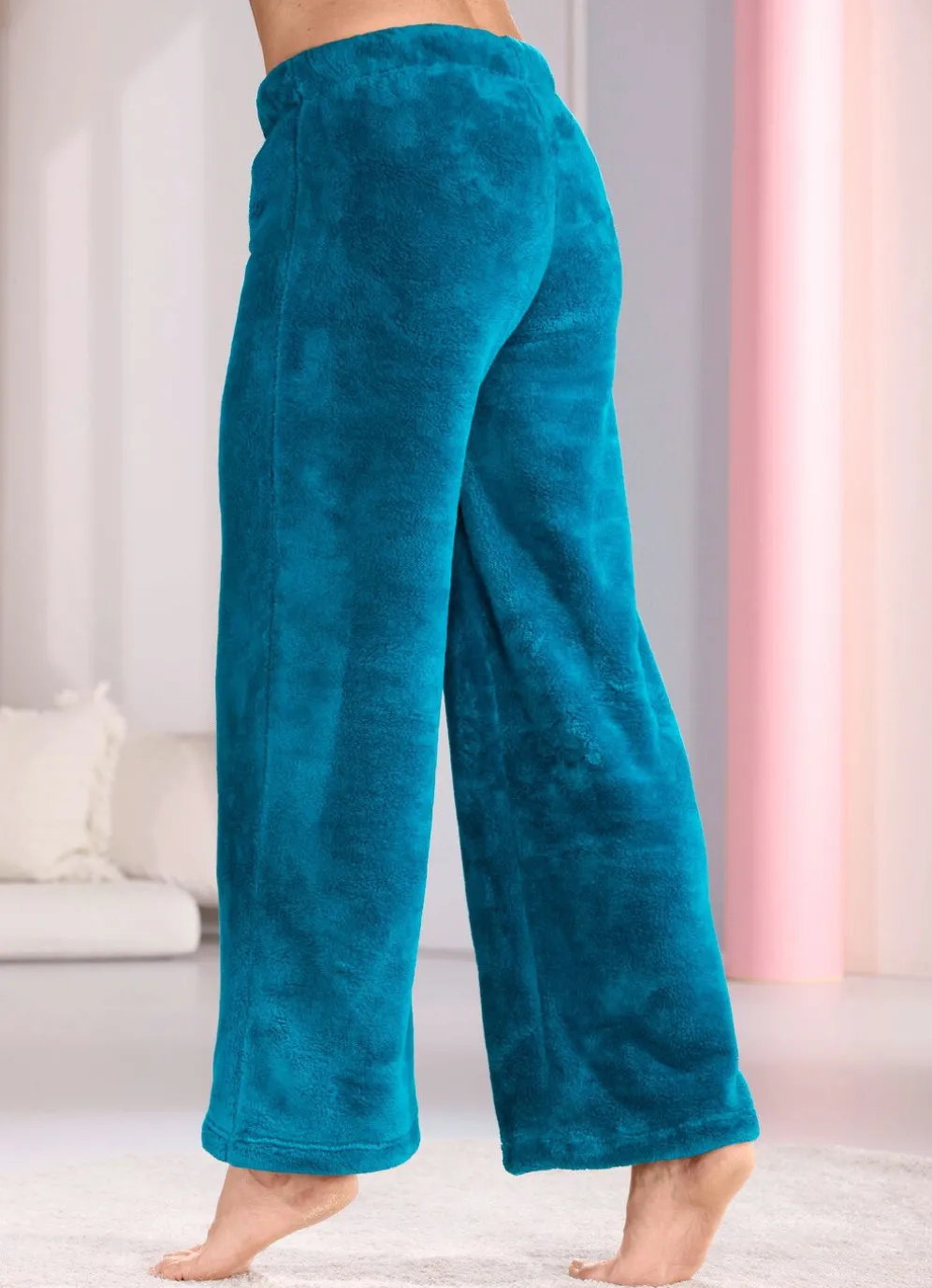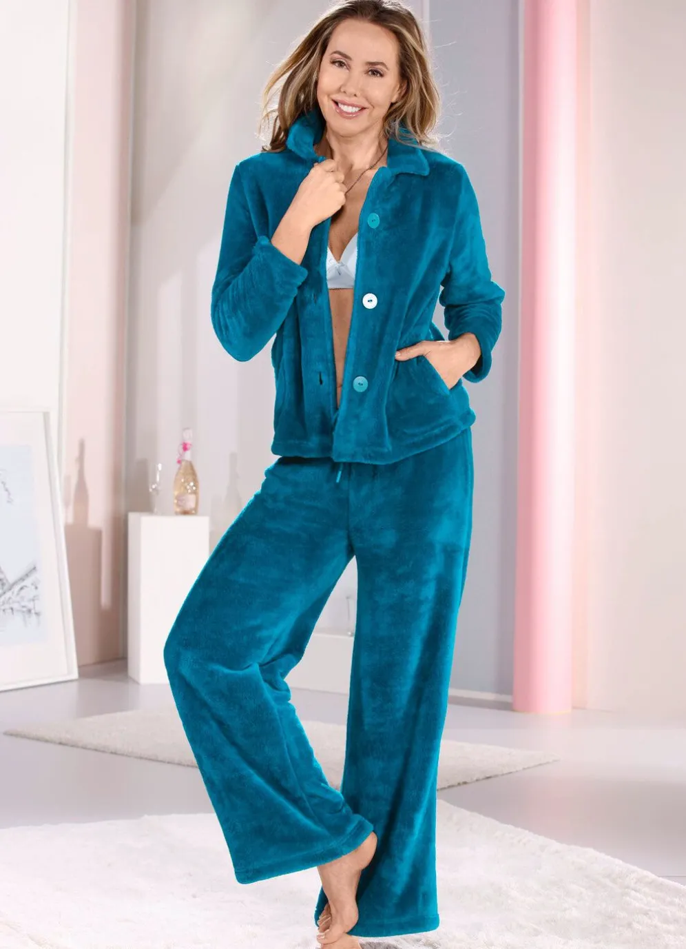 Flauschig weicher Lounge-Anzug von „Laurina“ in Petrol! Durchgeknöpftes Oberteil mit Reverskragen