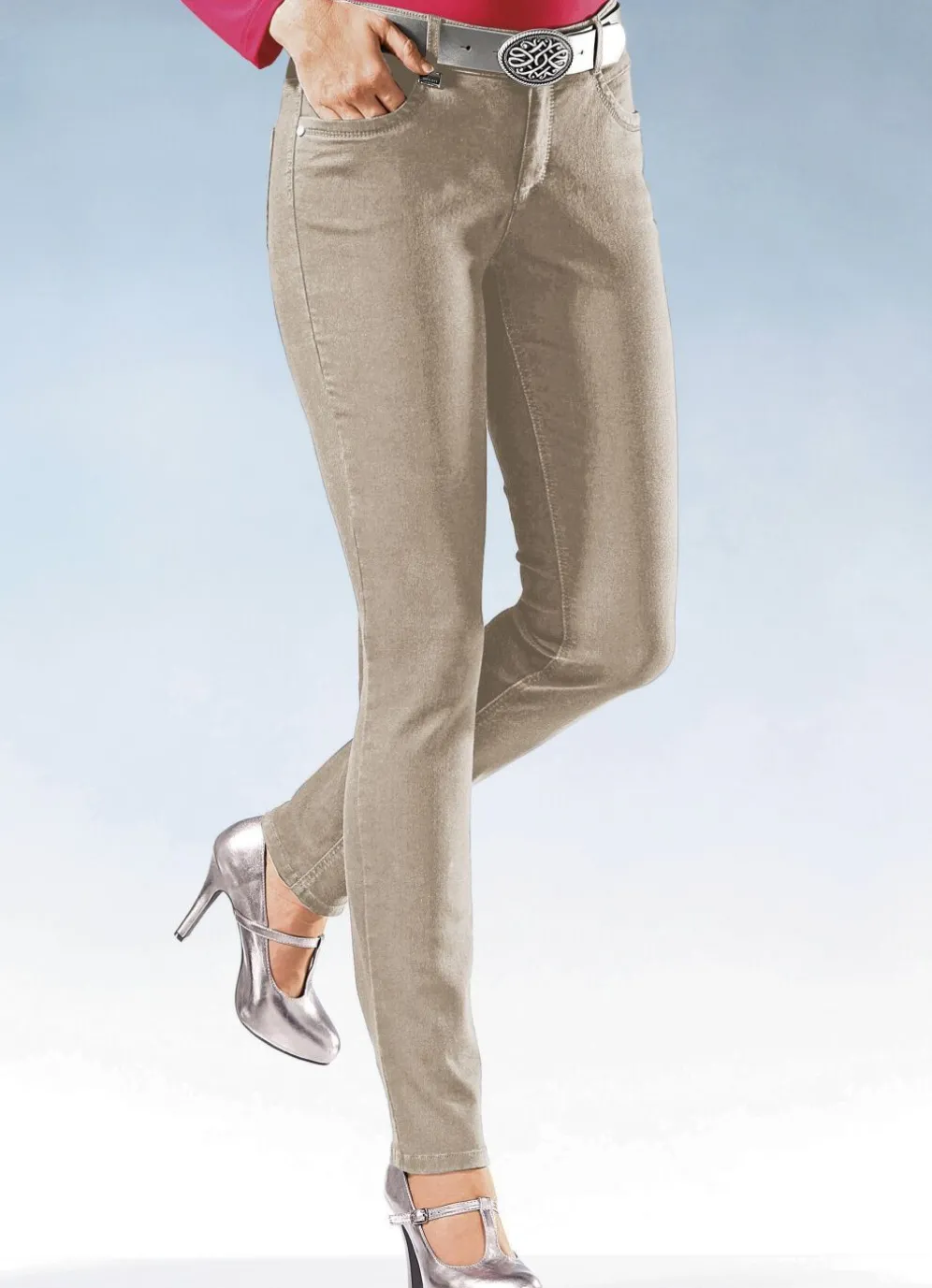 Die tragangenehme Qualität: querelastischer Power-Stretch-Denim, 65% Baumwolle, 31% Polyester und 4% Elasthan; in Grafit, Beige, Hellgrau, Rosé, Taupe und Bordeaux aus 91% Baumwolle, 6% Polyester und 3% Elasthan. Nach Öko-Tex Standard 100