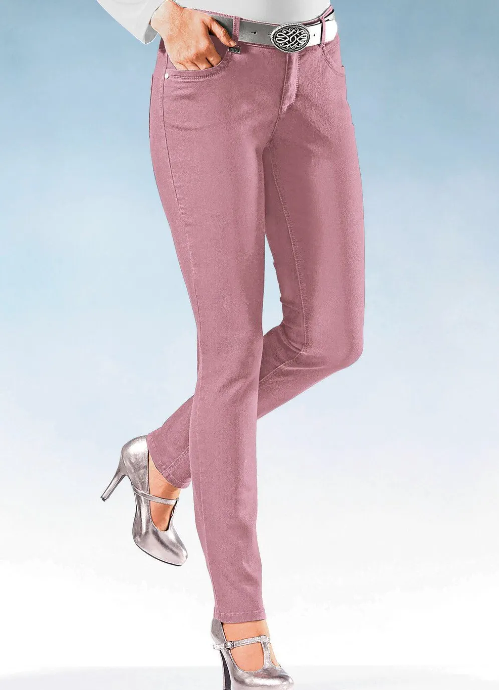 Die tragangenehme Qualität: querelastischer Power-Stretch-Denim, 65% Baumwolle, 31% Polyester und 4% Elasthan; in Grafit, Beige, Hellgrau, Rosé, Taupe und Bordeaux aus 91% Baumwolle, 6% Polyester und 3% Elasthan. Nach Öko-Tex Standard 100