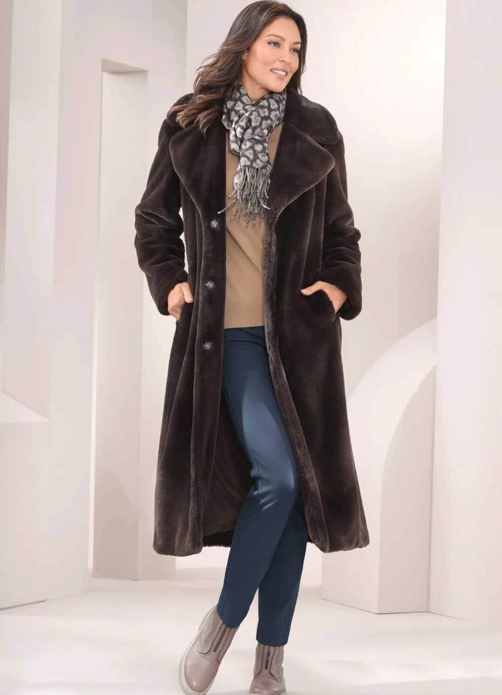 Flauschiger, mokkafarbener Mantel mit Reverskragen, verdeckter Druckerleiste und Schubtaschen. Länge ca. 120 cm. Die Qualität: Kunstpelz und Taftfutter jeweils aus 100% Polyester. Waschbar