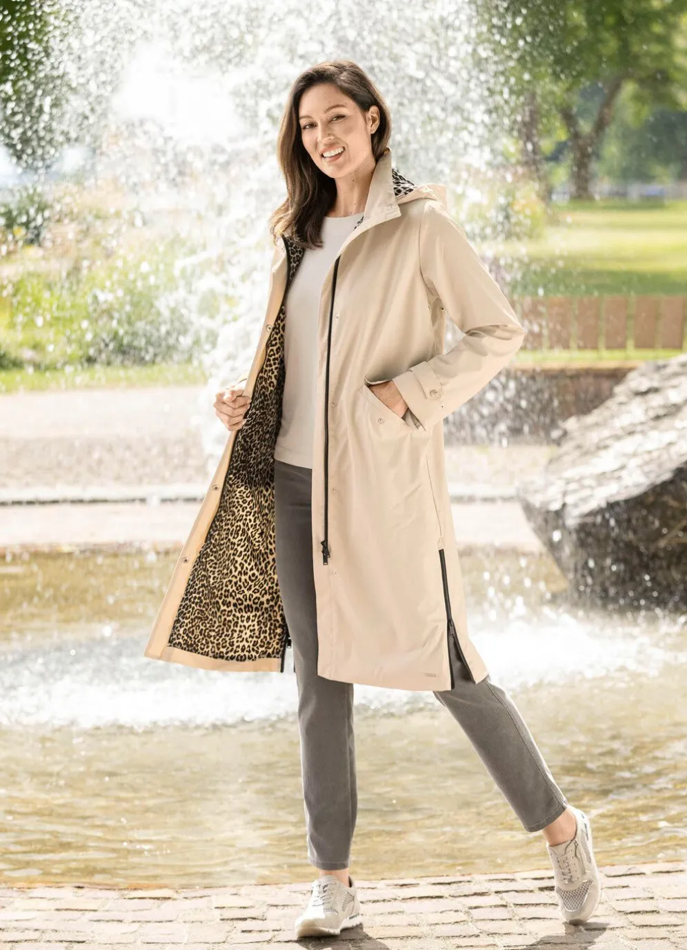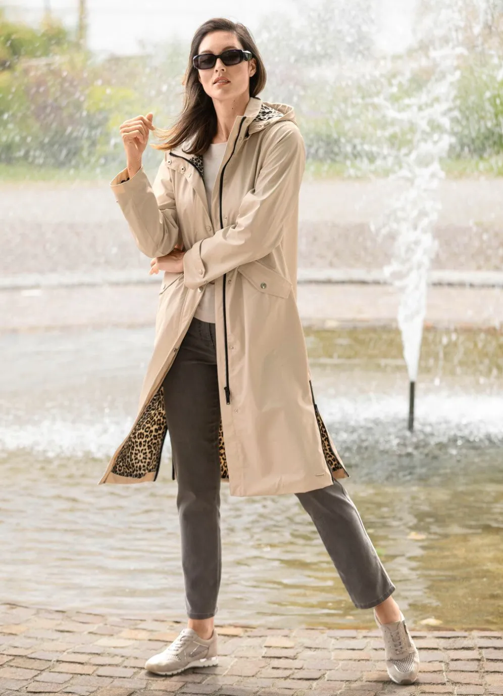 Kittfarbener Mantel in leichter A-Linie mit Durchzugsband und Stopper an der abnehmbaren Kapuze, durch 2-Wege-Reißverschluss unter der Druckerleiste hoch schließbarem Stehkragen, Drucker an den Pattentaschen, weitenregulierbarem Riegel und Drucker an den Ärmelabschlüssen, Reißverschluss an den Seitenschlitzen sowie einer Innentasche. Länge ca. 100 cm, ab Gr. 42 ca.103 cm, ab Gr. 48 ca. 106 cm.