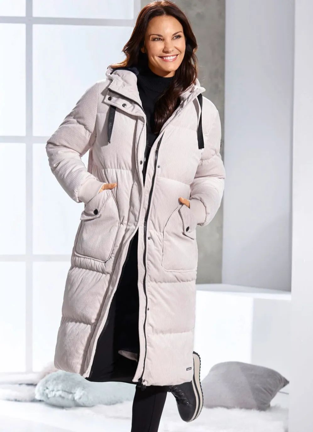 Mantel in Beige: feste Kapuze mit Bindeband, hoch schließbarer Stehkragen mit Druckern, 2-Wege-Reißverschluss unter der verdeckten Druckerleiste, große aufgesetzte Taschen mit Patte und Drucker sowie Rippenstrickbündchen an den Ärmelabschlüssen. Länge ca. 106 cm.