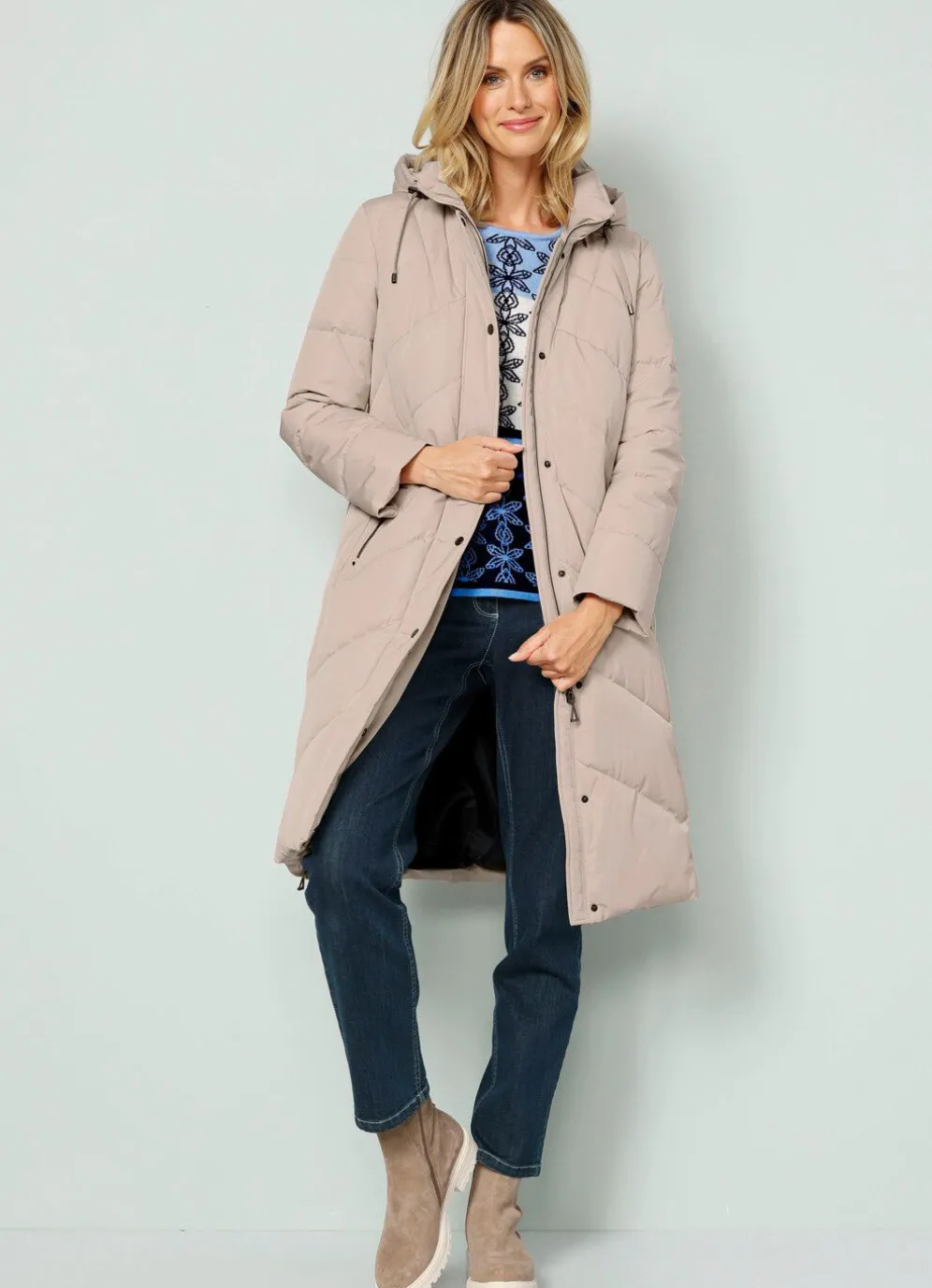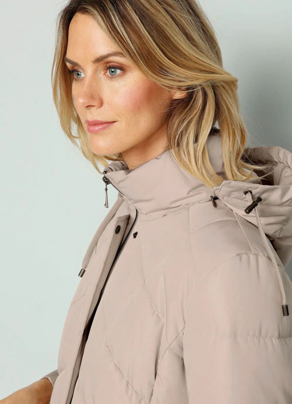 Mantel mit Durchzugsband und Stopper in der abnehmbaren Kapuze, durch Reißverschluss unter der Druckerleiste hoch schließbarem Stehkragen, Reißverschluss an den Taschen und Seitenschlitzen, umschlagbaren Ärmeln sowie einer Innentasche. Länge ca. 102 cm, bei Kurz-Gr. ca. 98 cm