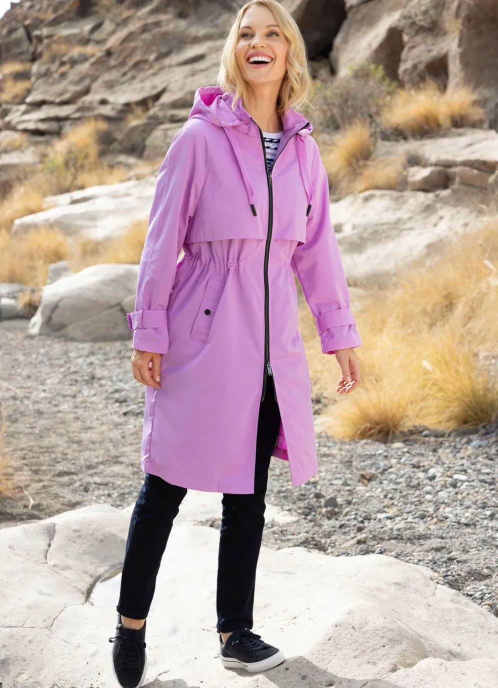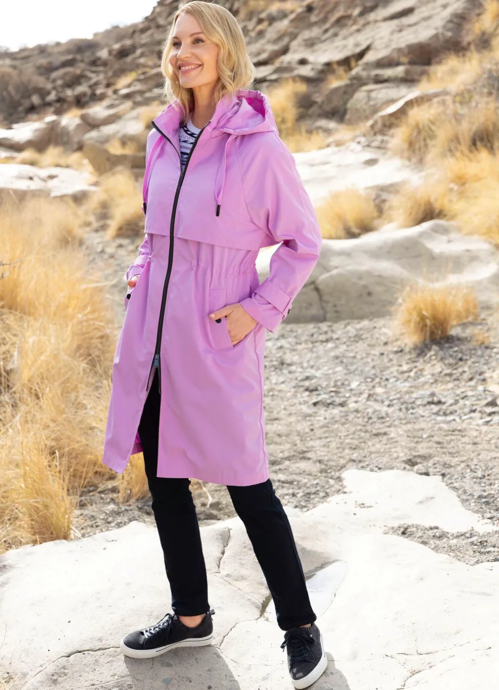 Mantel: abnehmbare Kapuze mit Bindeband, durch 2-Wege-Reißverschluss hoch schließbarer Stehkragen, Vorder- und Rückteilkoller, Durchzugsband und Stopper in der Taille, Schubtaschen mit Blende und Drucker sowie verstellbarer Riegel mit Drucker an den Ärmelabschlüssen. Länge ca. 102 cm.