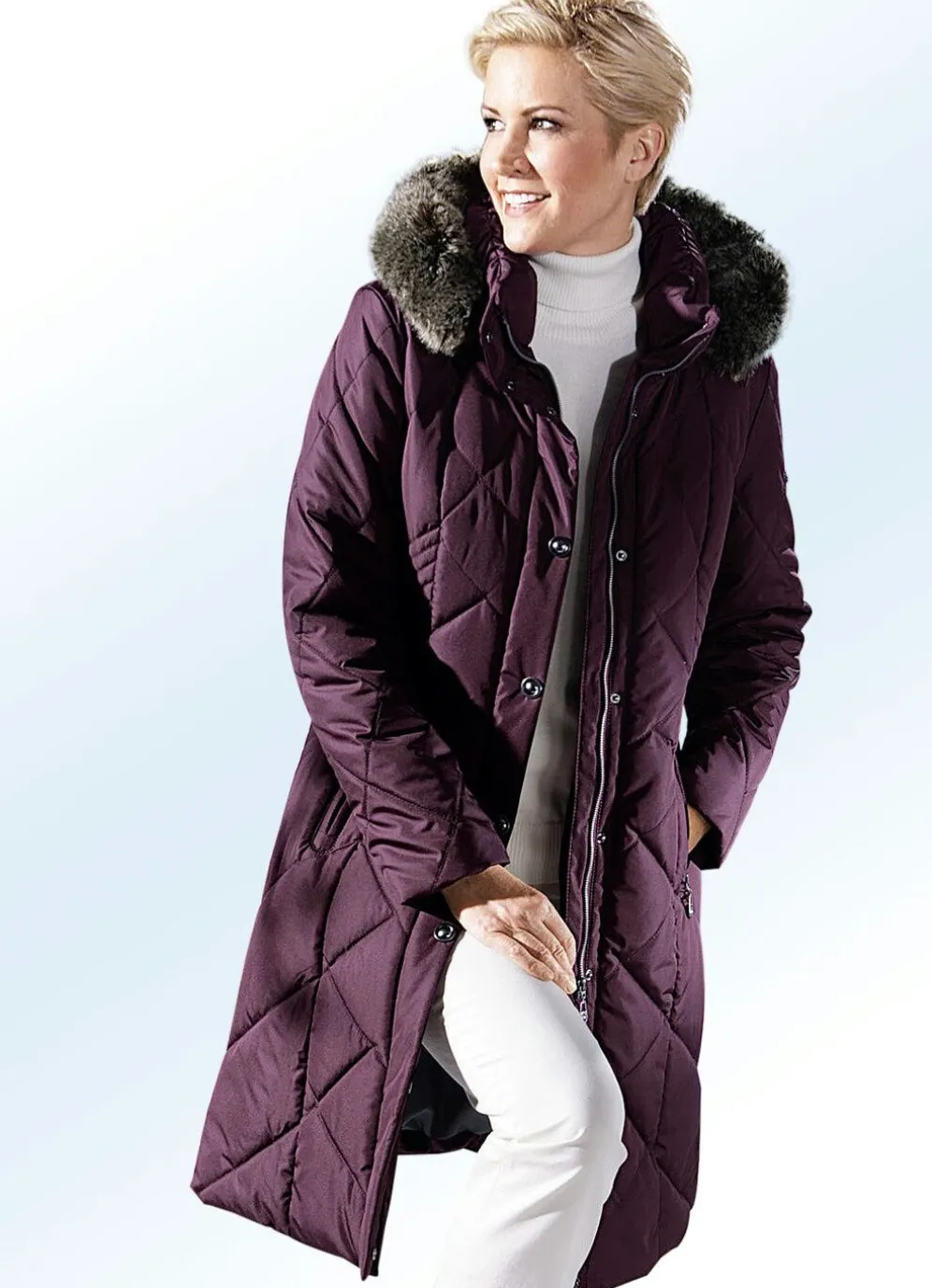 Große Klasse ist dieser herrliche, beerefarbene Mantel mit hohem Tragekomfort, Durchzugsband und Stopper in der abnehmbaren Kapuze mit abnehmbarem Kunstpelz-Besatz, figurfreundlichem Stepp, gesmoktem Stehkragen, Reißverschluss unter der Druckerleiste, umschlagbaren Ärmeln sowie einer Innentasche. Länge ca. 100 cm.