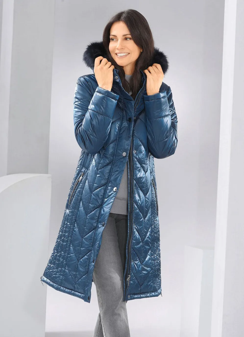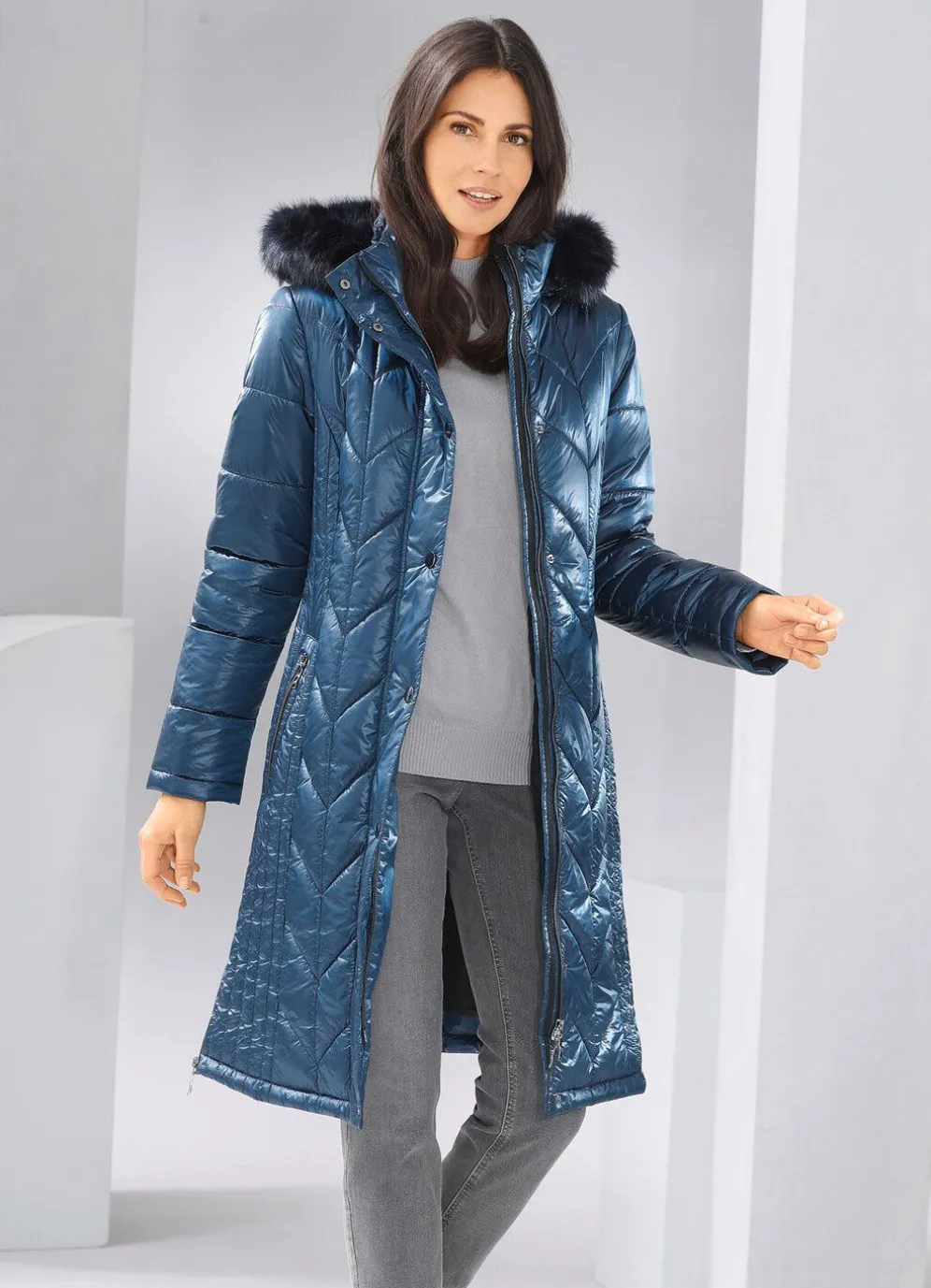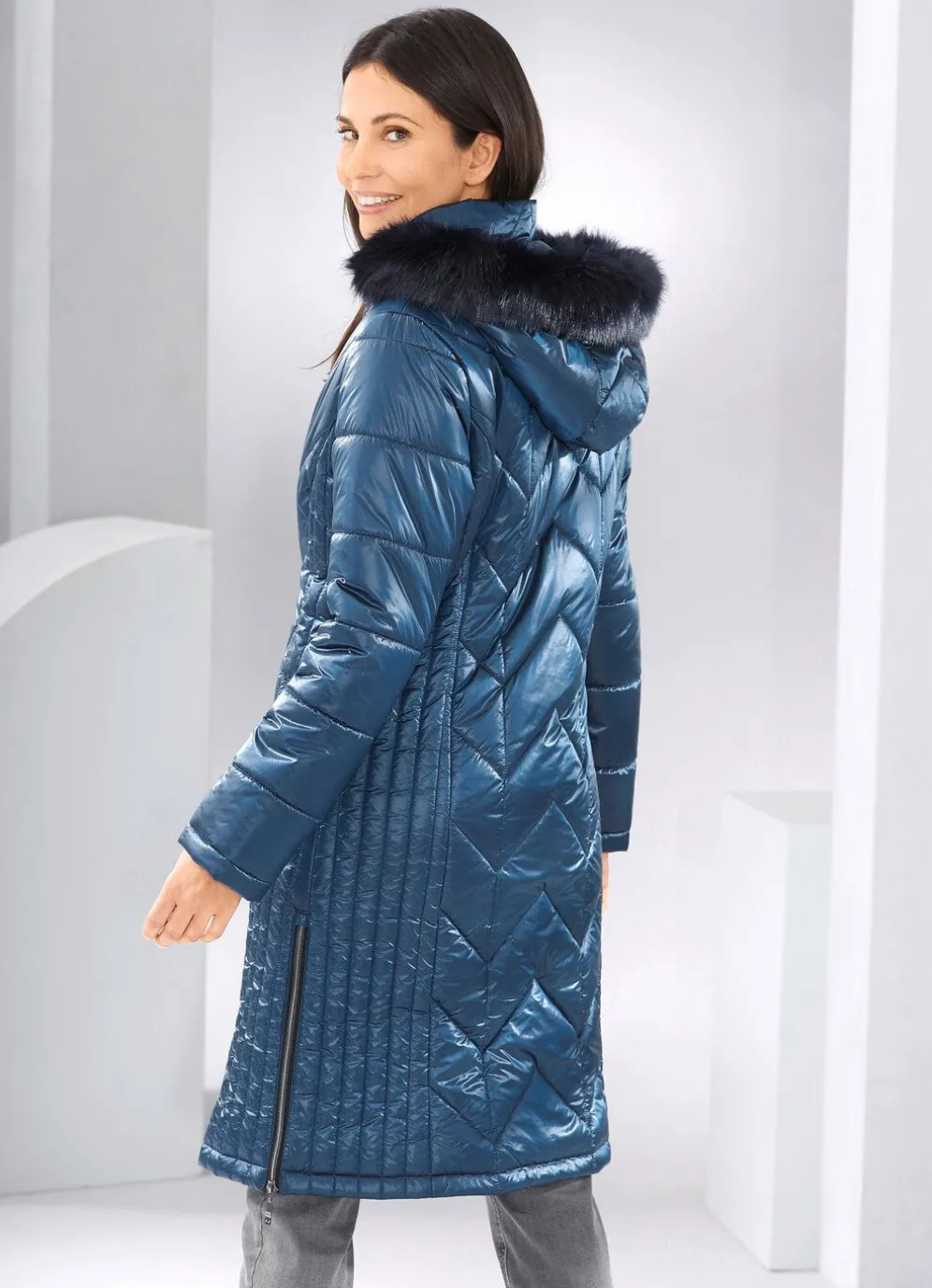 Mantel mit figurfreundlicher Längssteppung seitlich, abnehmbarer Kapuze mit Durchzugsband, Stopper und abnehmbarem Kunstpelz-Besatz, durch 2-Wege-Reißverschluss hoch schließbarem Stehkragen, Reißverschluss an den Paspeltaschen und Seitenschlitzen, umschlagbaren Ärmeln sowie einer Innentasche. Länge ca. 100 cm.