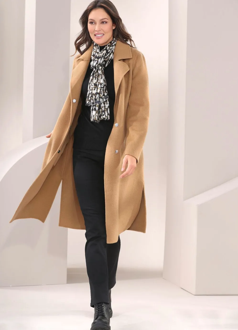 Bezaubernder, beidseitig geschlitzter Mantel in Hellbraun, mit Reverskragen, verdeckter Druckerleiste, Gürtelschlaufen, Bindegürtel, Schubtaschen sowie umschlagbaren Ärmeln. Länge ca. 110 cm.