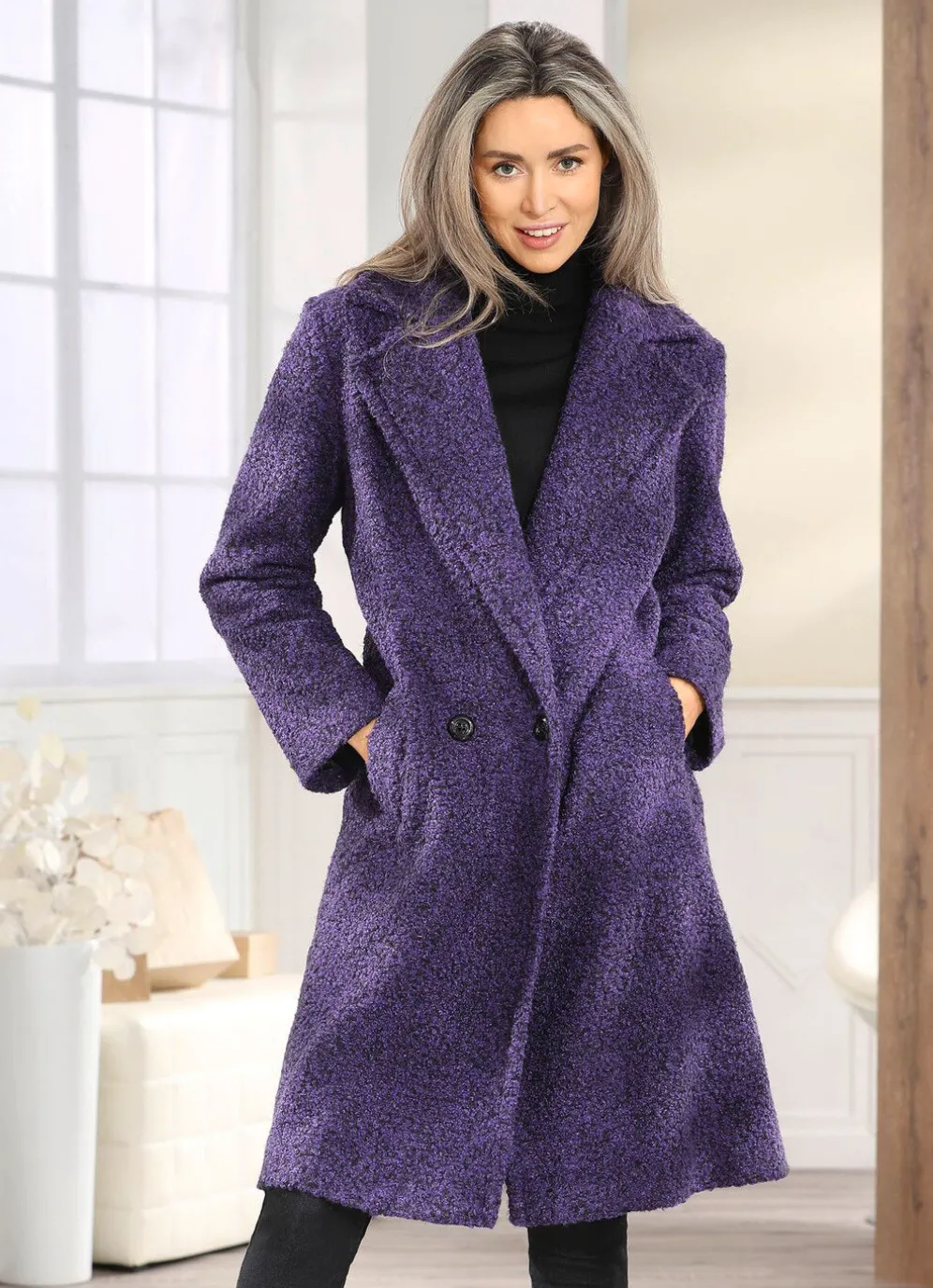 Doppelreihig geknöpfter Mantel in Lila-Schwarz, mit großem Reverskragen und Schubtaschen mit Blende. Länge ca. 100 cm, ab Gr. 42 ca. 102 cm, ab Gr. 48 ca. 104 cm.
