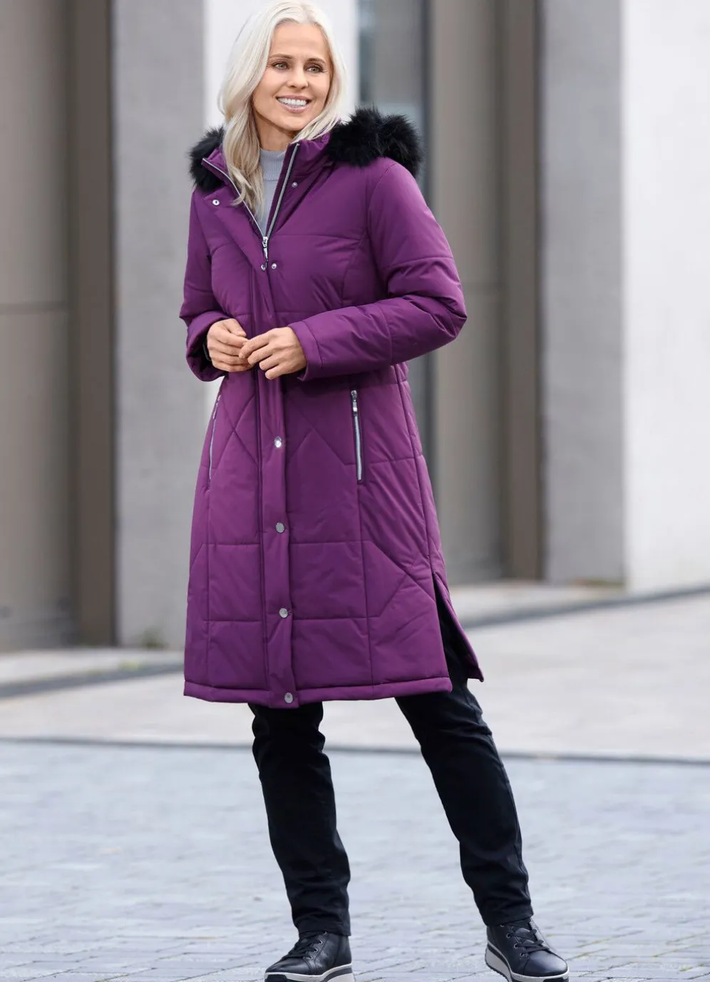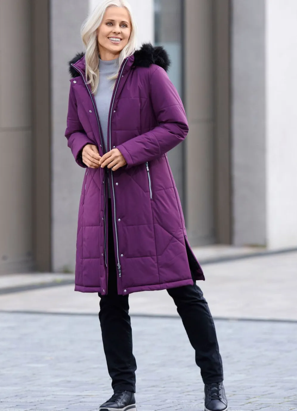 Pfiffiger Kurzmantel mit Durchzugsband, Stopper und abnehmbarem Kunstpelz-Besatz an der abnehmbaren Kapuze, hoch schließbarem Stehkragen, 2-Wege-Reißverschluss unter der Druckerleiste, Reißverschluss an den Taschen und Seitenschlitzen, umschlagbaren Ärmeln sowie zwei Innentaschen. Länge ca. 103 cm.