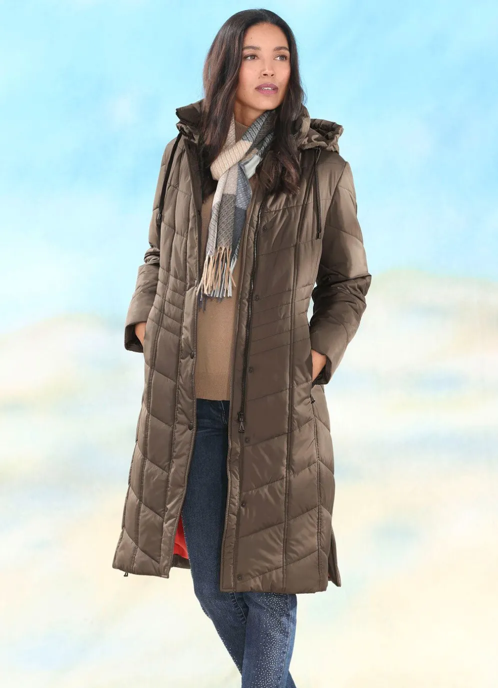 Ansprechender Mantel mit Durchzugsband und Stopper in der abnehmbaren Kapuze, durch Reißverschluss unter der Druckerleiste hoch schließbarem Stehkragen, Reißverschluss an den Nahttaschen und Seitenschlitzen, umschlagbaren Ärmeln sowie einer Innentasche. Länge ca. 105 cm.