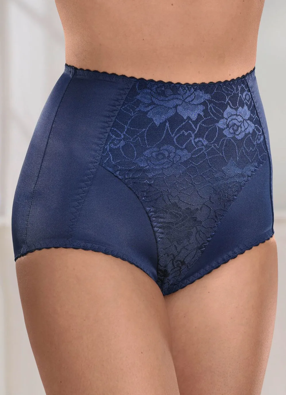 Miederhose mit unterlegtem Einsatz aus Elastiktüll mit Jaquard-Dessin sowie Baumwolleinlage im Schritt.