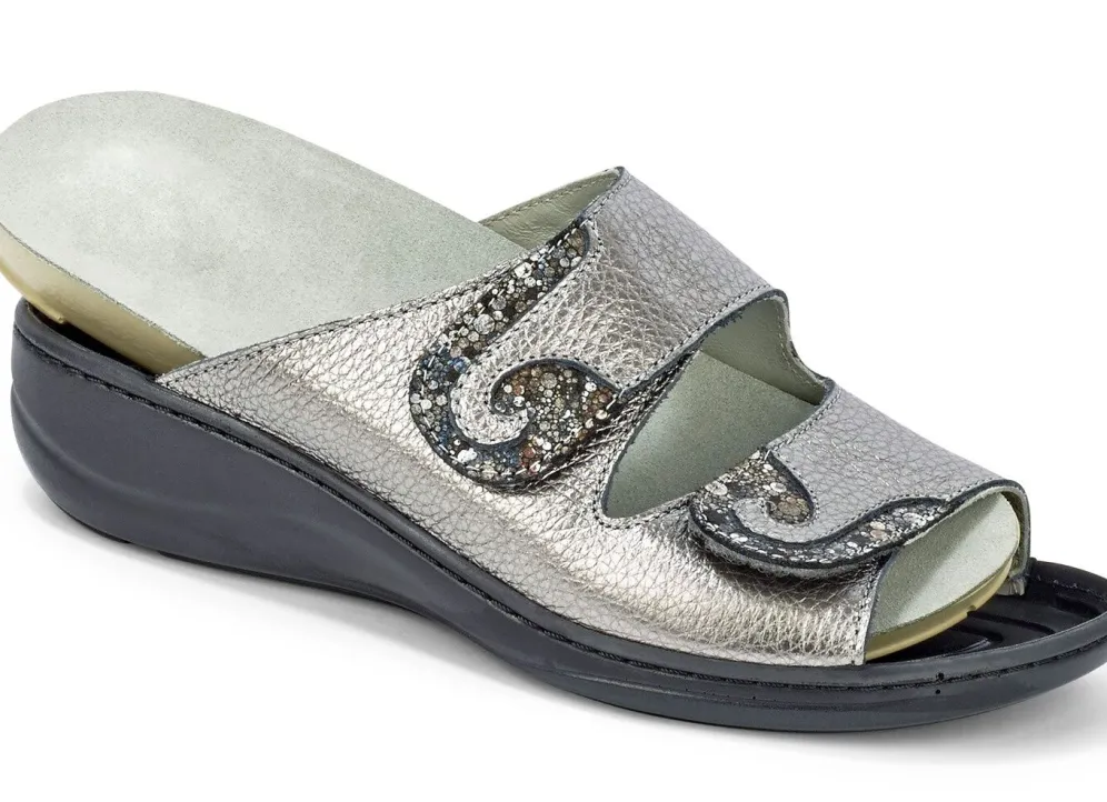 Pantoletten aus Rind-Nappa- oder Knautschlackleder, mit geprägten Einsätzen: Weite H, zwei Klettspangen, Lederfutter, herausnehmbares Lederfußbett, PU-TR-Profilsohle sowie 35 mm Keilabsatz
