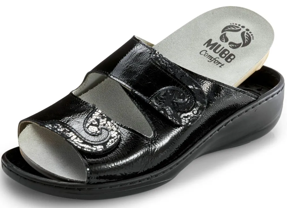Pantoletten aus Rind-Nappa- oder Knautschlackleder, mit geprägten Einsätzen: Weite H, zwei Klettspangen, Lederfutter, herausnehmbares Lederfußbett, PU-TR-Profilsohle sowie 35 mm Keilabsatz