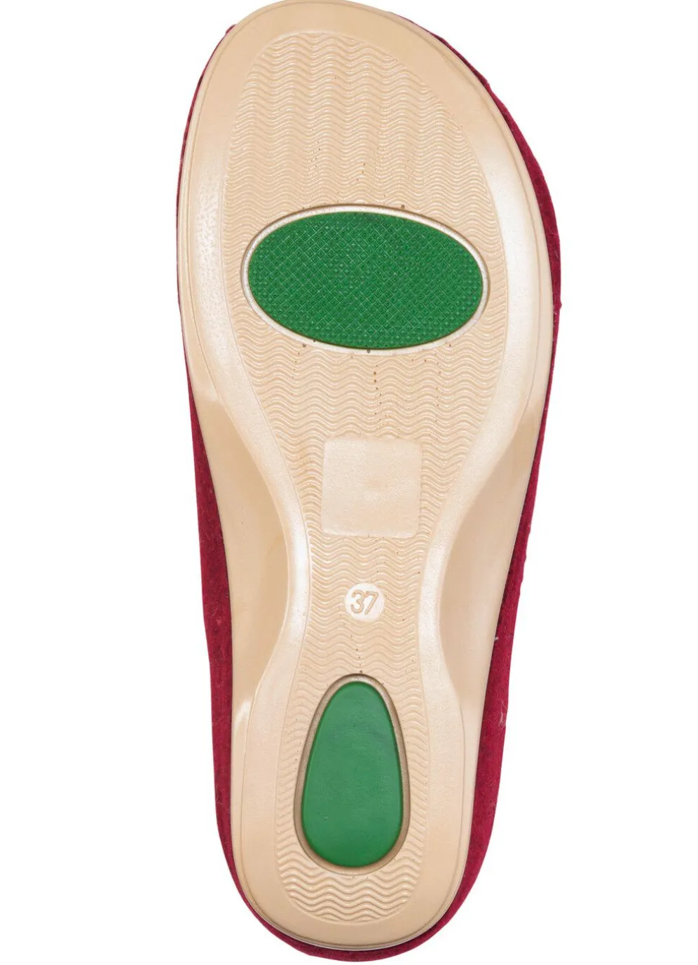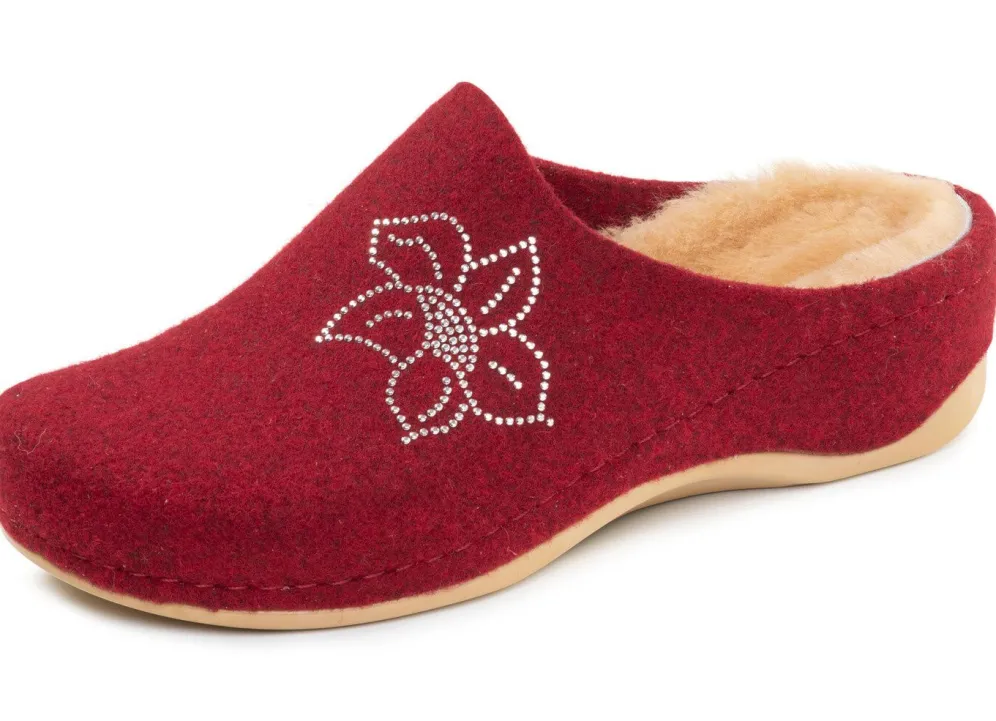 Hausschuhe aus Wollfilz mit Glitzer-Applikation: in Weite H, herausnehmbares, mit echtem Lammfell bezogenes Fußbett, leichte PU-TR-Laufsohle sowie 35 mm Keilabsatz