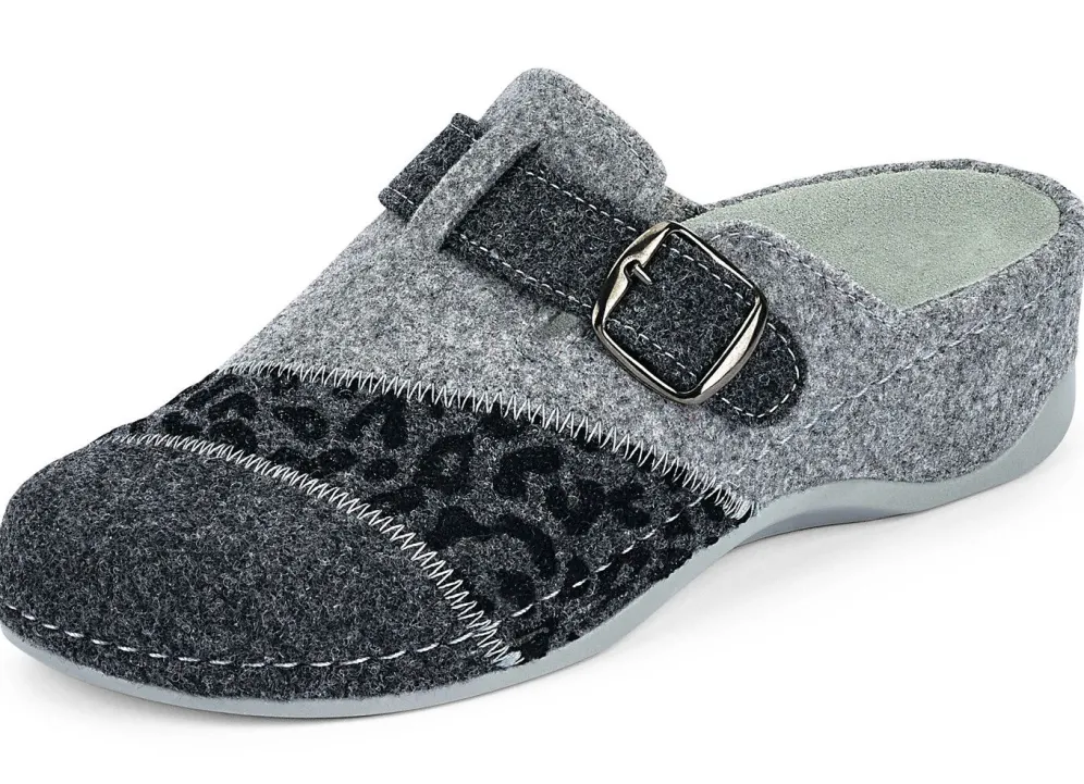 Hausschuhe aus Wollfilz, teilweise mit Raubtierfell-Prägung: in Weite H, verstellbare Spange, herausnehmbares Lederfußbett, leichte PU-TR-Laufsohle sowie 35 mm Keilabsatz