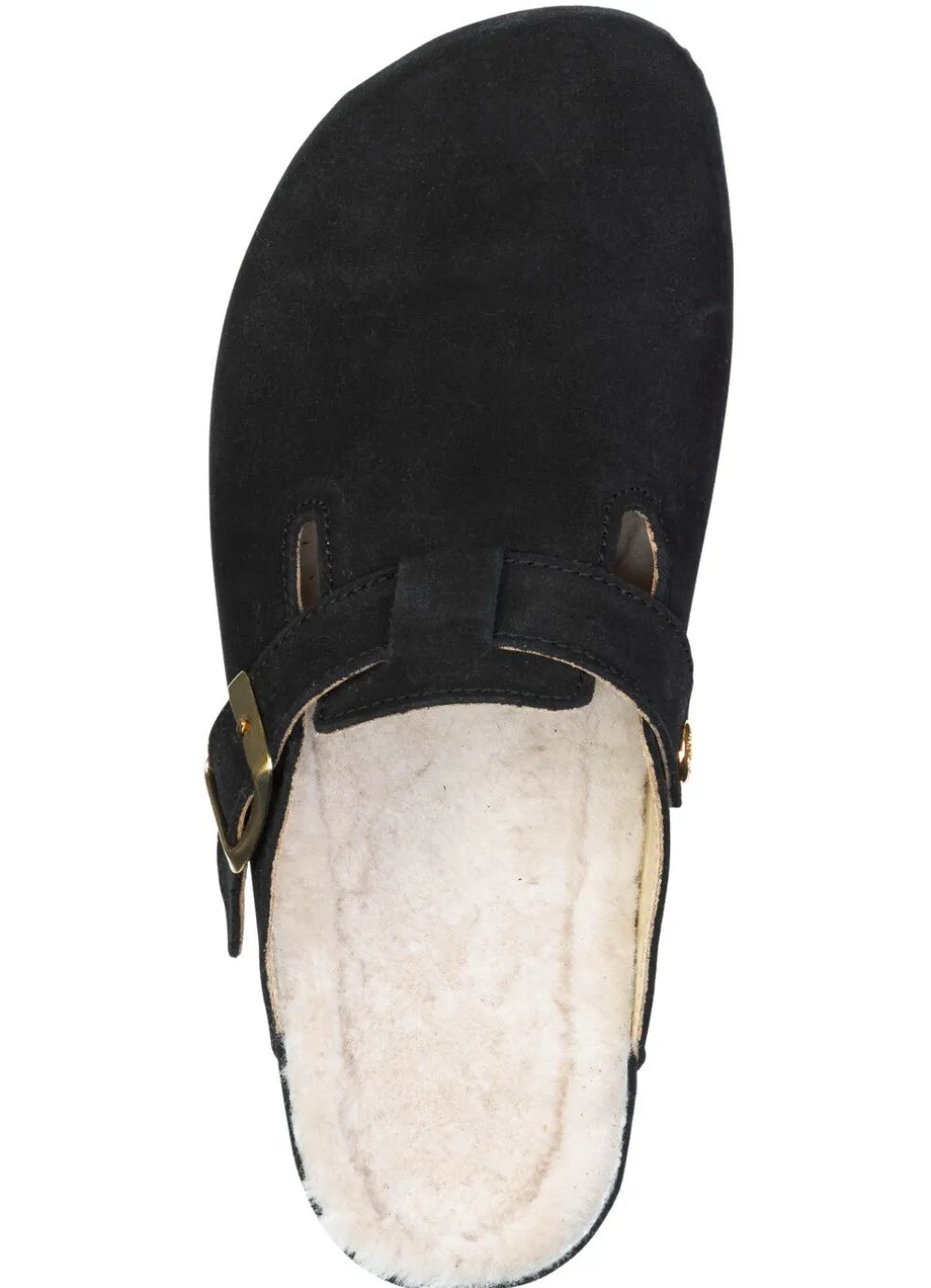 Hausschuhe aus Rind-Veloursleder, mit verstellbarer Spange: in Weite H, Lederfutter, Fußbett mit echtem Lammfell bezogen, superleichte PU-TR-Profilsohle sowie 15 mm Keilabsatz
