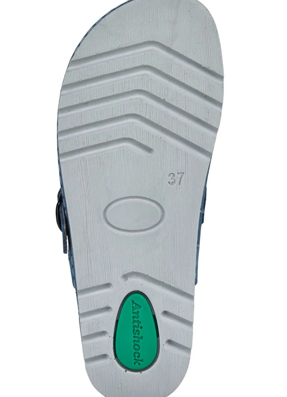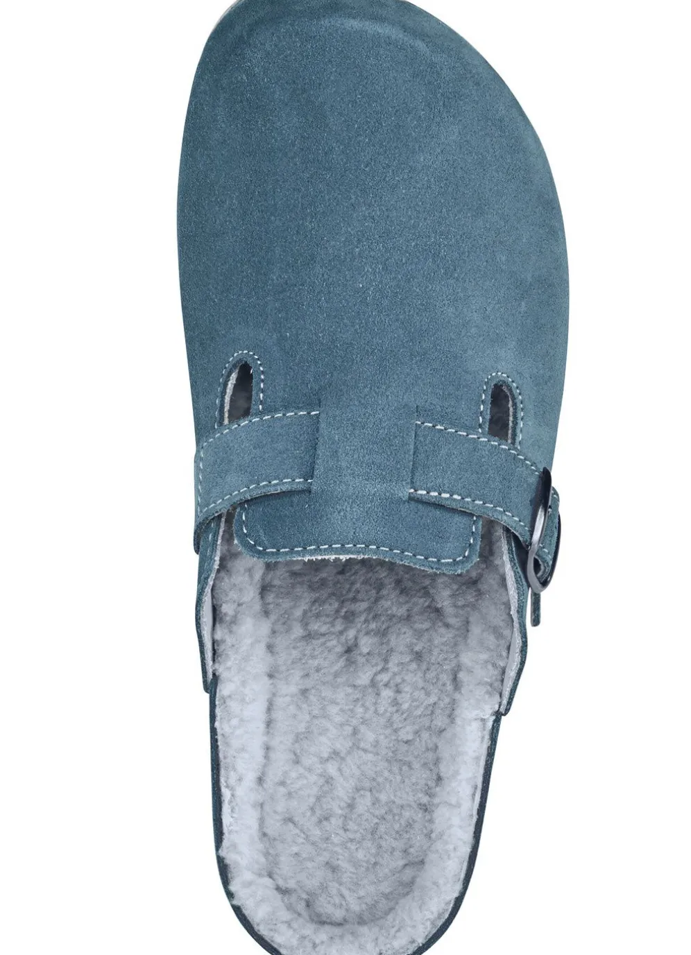 Hausschuhe aus Rind-Veloursleder, mit verstellbarer Spange: in Weite H, Lederfutter, Fußbett mit echtem Lammfell bezogen, superleichte PU-TR-Profilsohle sowie 15 mm Keilabsatz