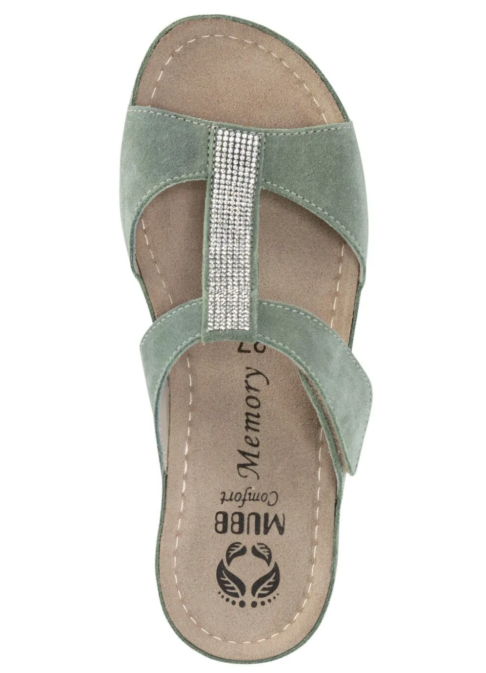 Pantolette aus Veloursleder, teilweise mit funkelnden Glitzersteinchen besetzt: Weite G, verstellbare Klettspange, Lederfutter, gepolstertes Lederfußbett, leichte PU-TR-Riffelsohle sowie 25 mm Keilabsatz